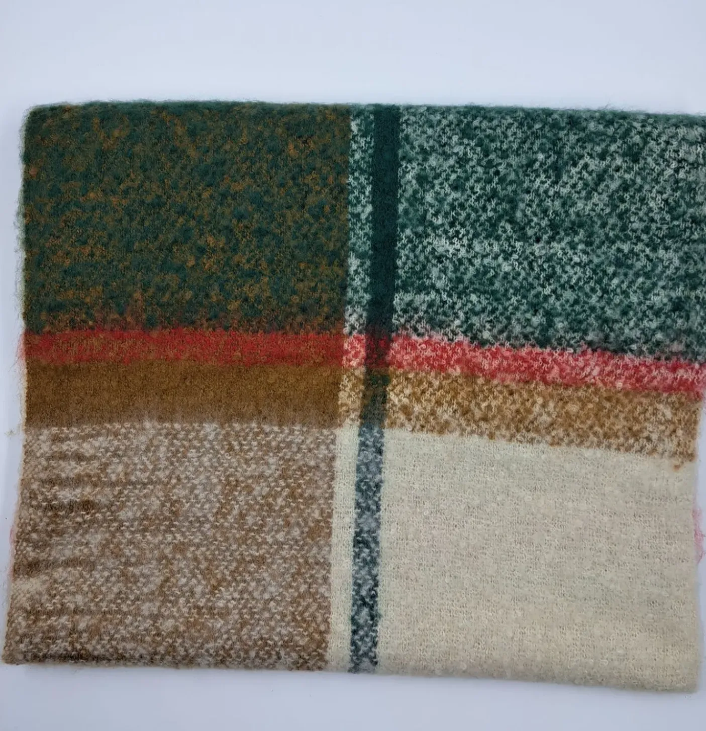 Sciarpe morbidissima con frange. Dettagli verde rosso beige. Poliestere. Larga e avvolgente.