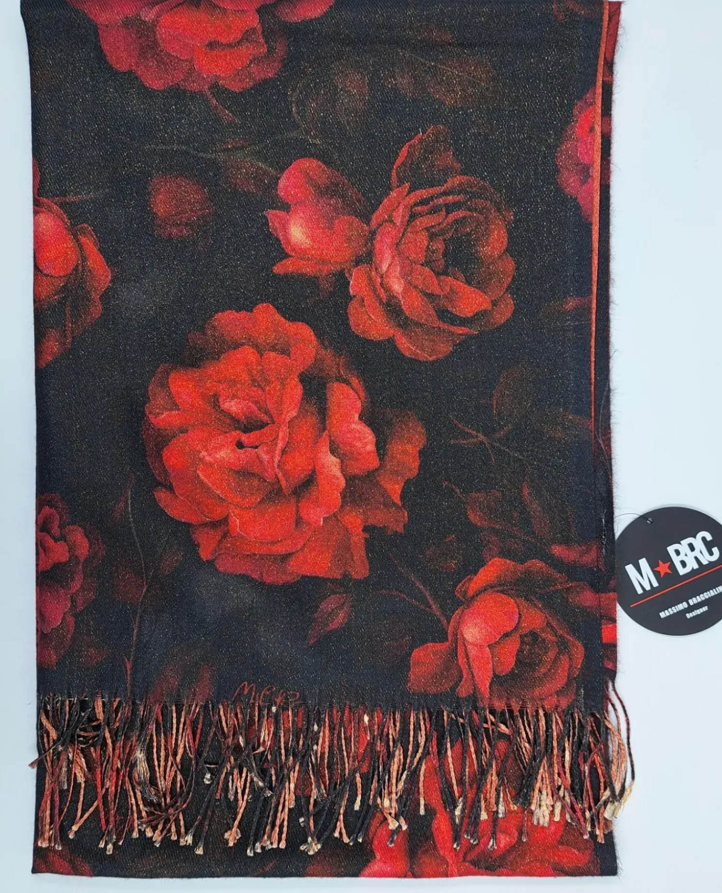 Sciarpa fantasia colore fantasia rose rosse. Con frange. Double face. 100% viscosa morbida.