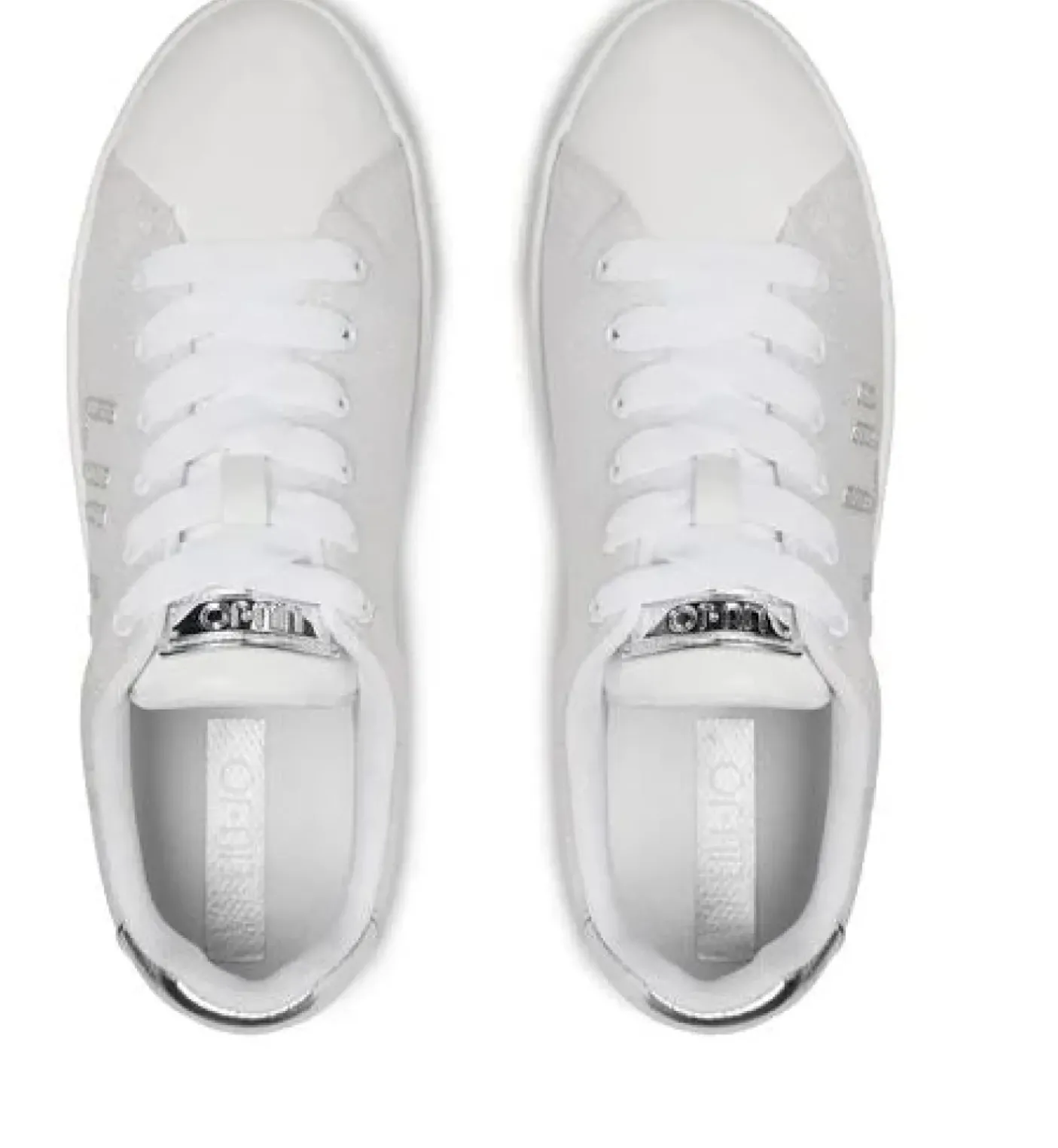 Sneakers bianche con tomaia glitterata e maxi logo. Spoiler argento. Fondo gomma con logo in rilievo. Altezza suola: 4 cm.