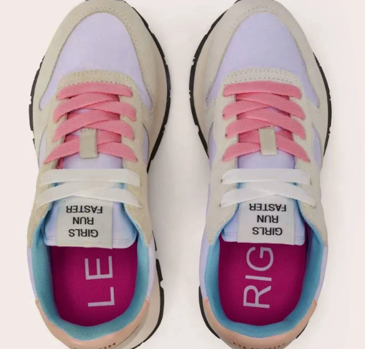 Sneakers in camoscio e tessuto. Logo celeste sul lato. Chiusura con lacci, fondo in gomma bicolor. Spoiler cipria. Lacci cotone bianco e rosa.