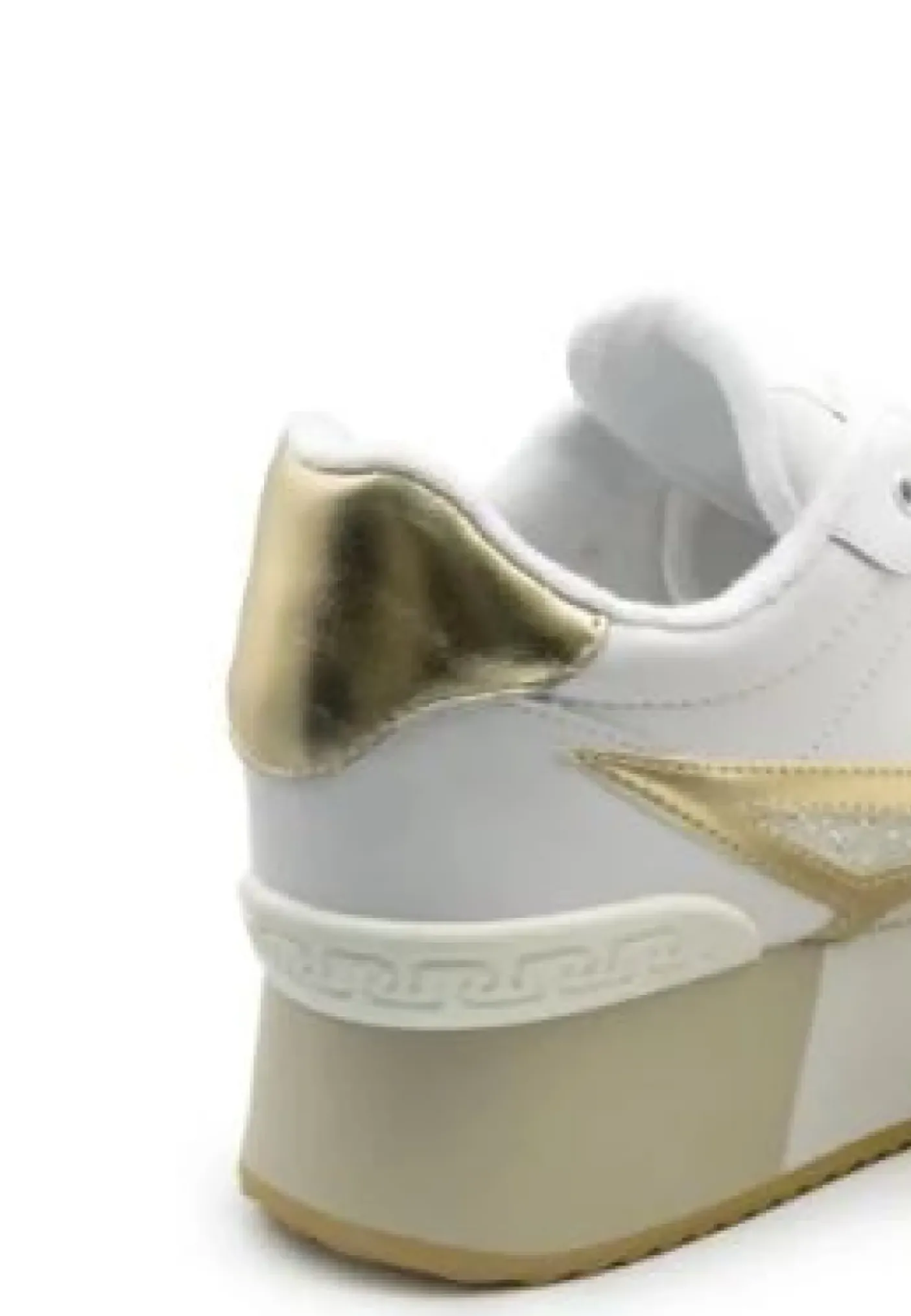 Sneakers in pelle con applicazioni glitter sui lati e disegno stella gold. Spoiler gold. Chiusura con lacci. Fondo gomma 5cm