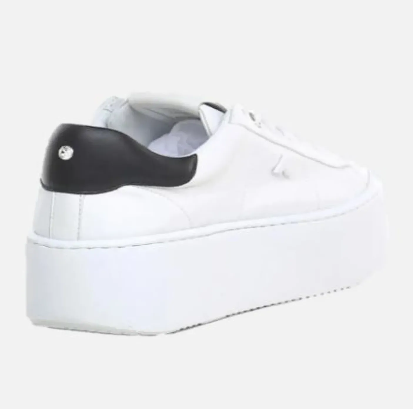 Sneakers in vera pelle con spoiler nero e piccolo strass. Logo metallico sul lato. Fondo gomma 5cm. Chiusura con lacci.
