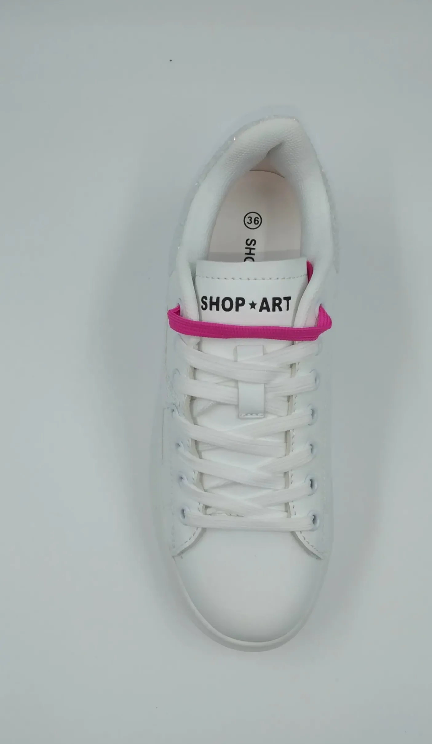 Sneakers con decorazione stella paillettes e applicazione glitter sul retro. Chiusura con lacci bianchi e fuxia. Fondo gomma.
