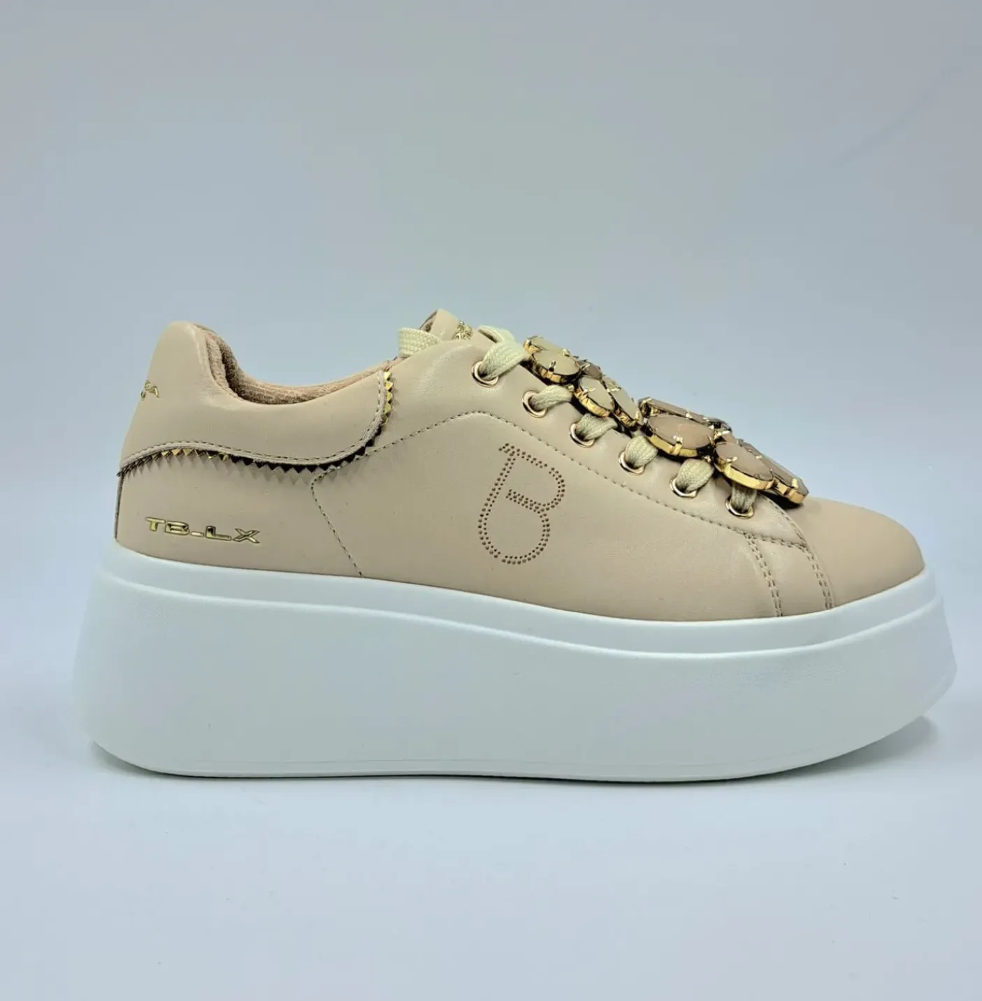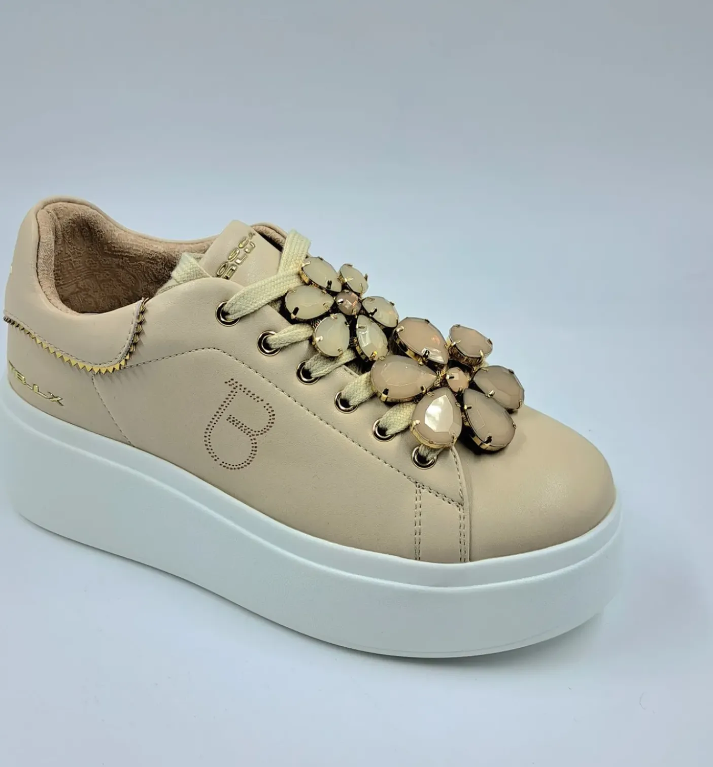 Sneakers in vera pelle, rivestita internamente in pelle. Charms asportabile maxi fiori pietre beige e nude. Dettagli gold. Chiusura con lacci. Fondo gomma 5cm.