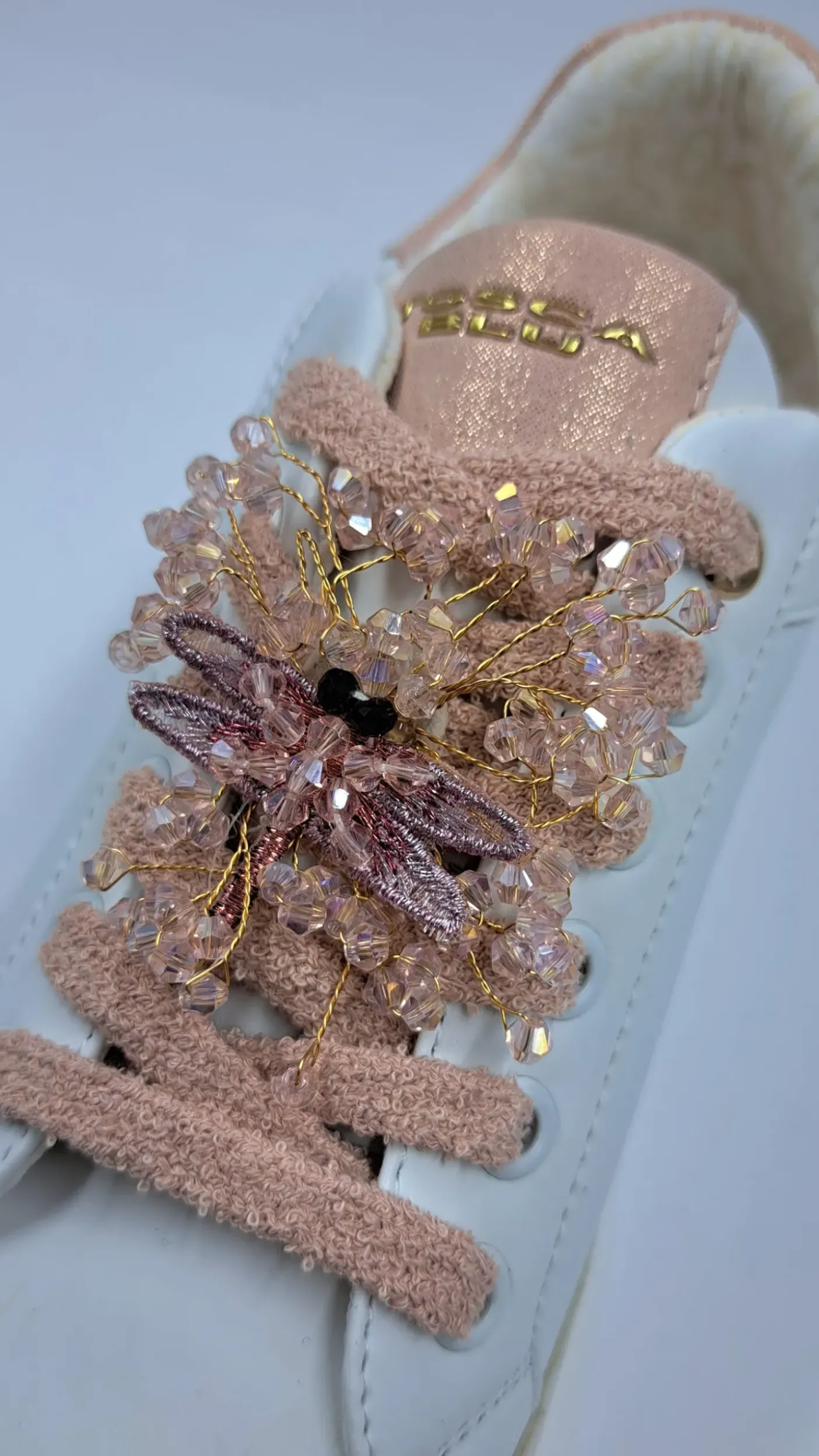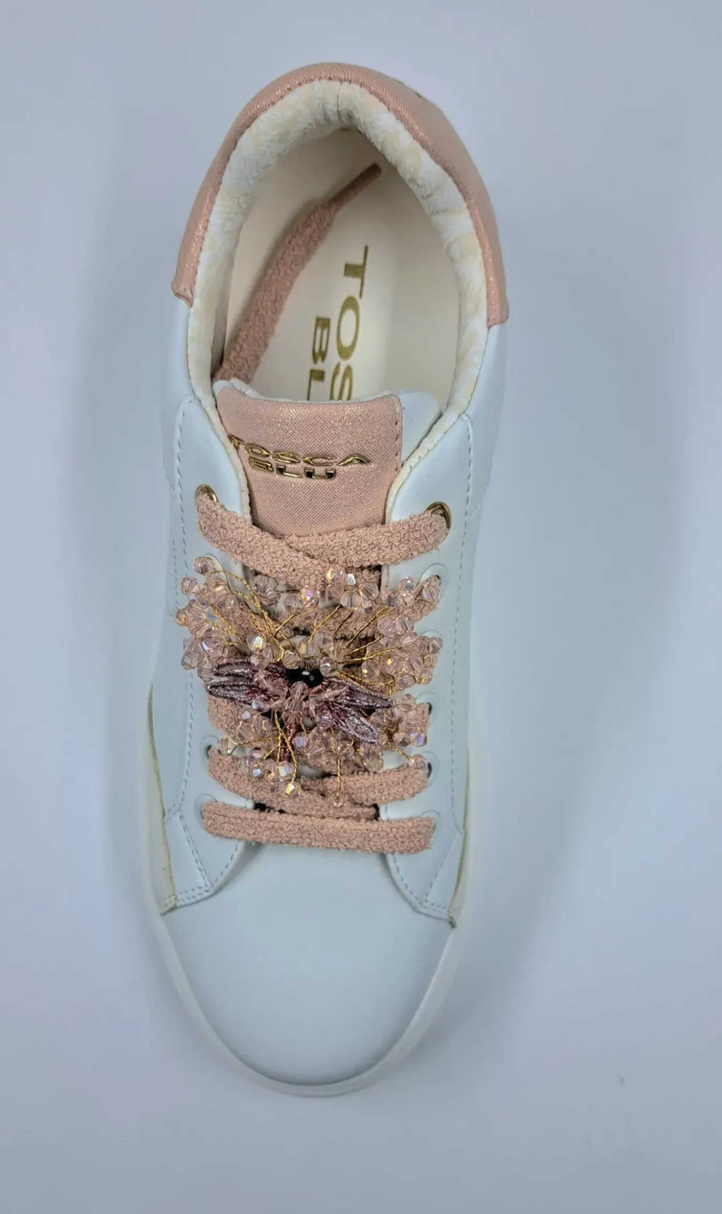 Sneakers in vera pelle, rivestita internamente in pelle. Charms asportabile libellula cipria e corallini. Spoiler pelle cipria lux. Dettagli panna. Chiusura con lacci cipria. Fondo gomma 5cm.