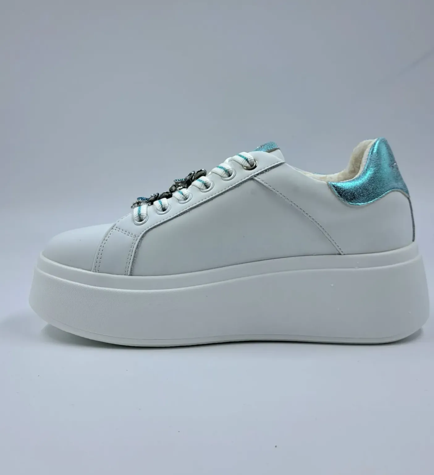 Sneakers in vera pelle, rivestita internamente in pelle. Charms asportabile fiori strass celeste e bianchi. Spoiler pelle celeste lux. Chiusura con lacci. Fondo gomma 5cm.