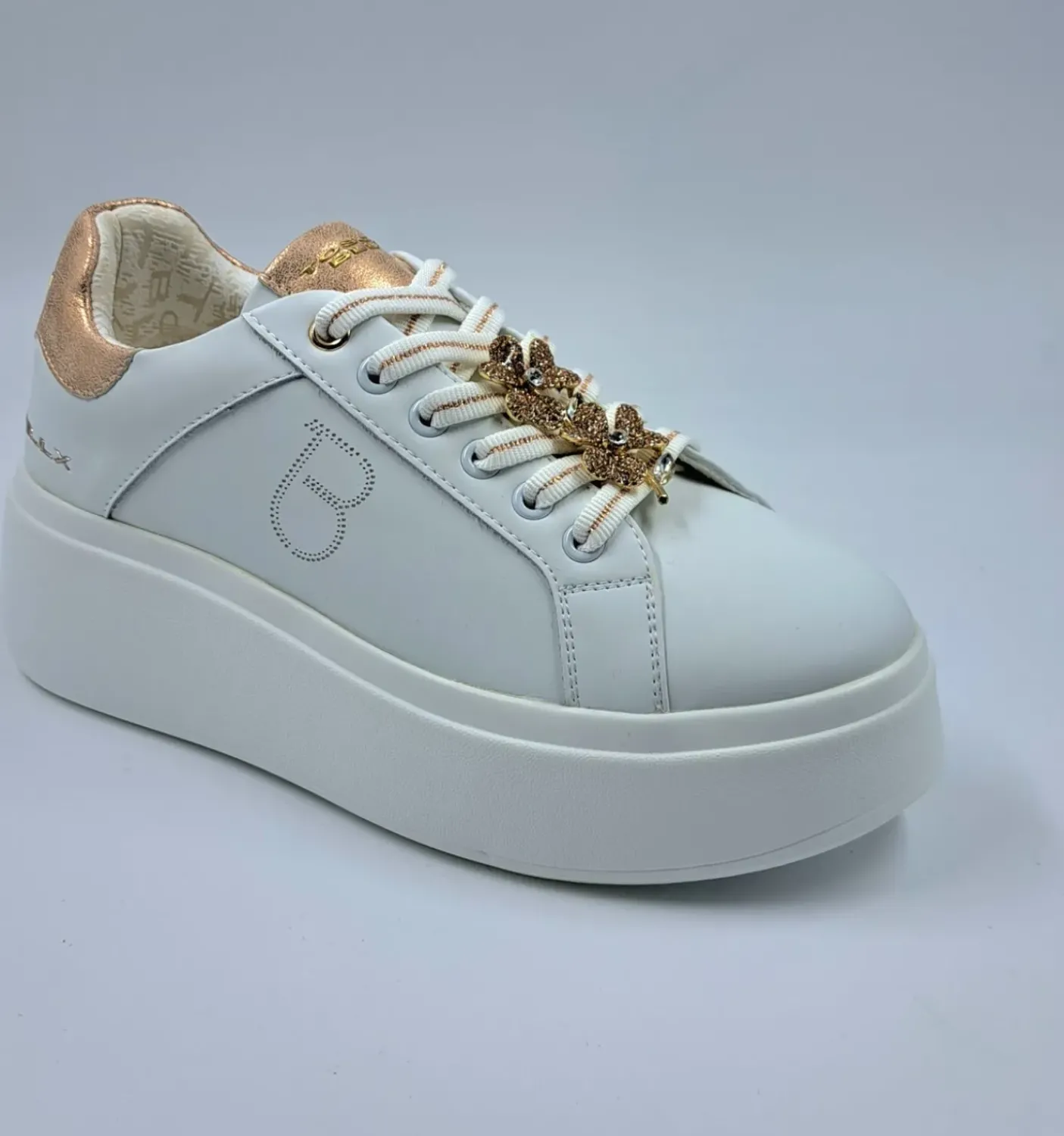 Sneakers in vera pelle, rivestita internamente in pelle. Charms asportabile fiori strass cipria e bianchi. Spoiler pelle cipria lux. Chiusura con lacci. Fondo gomma 5cm.