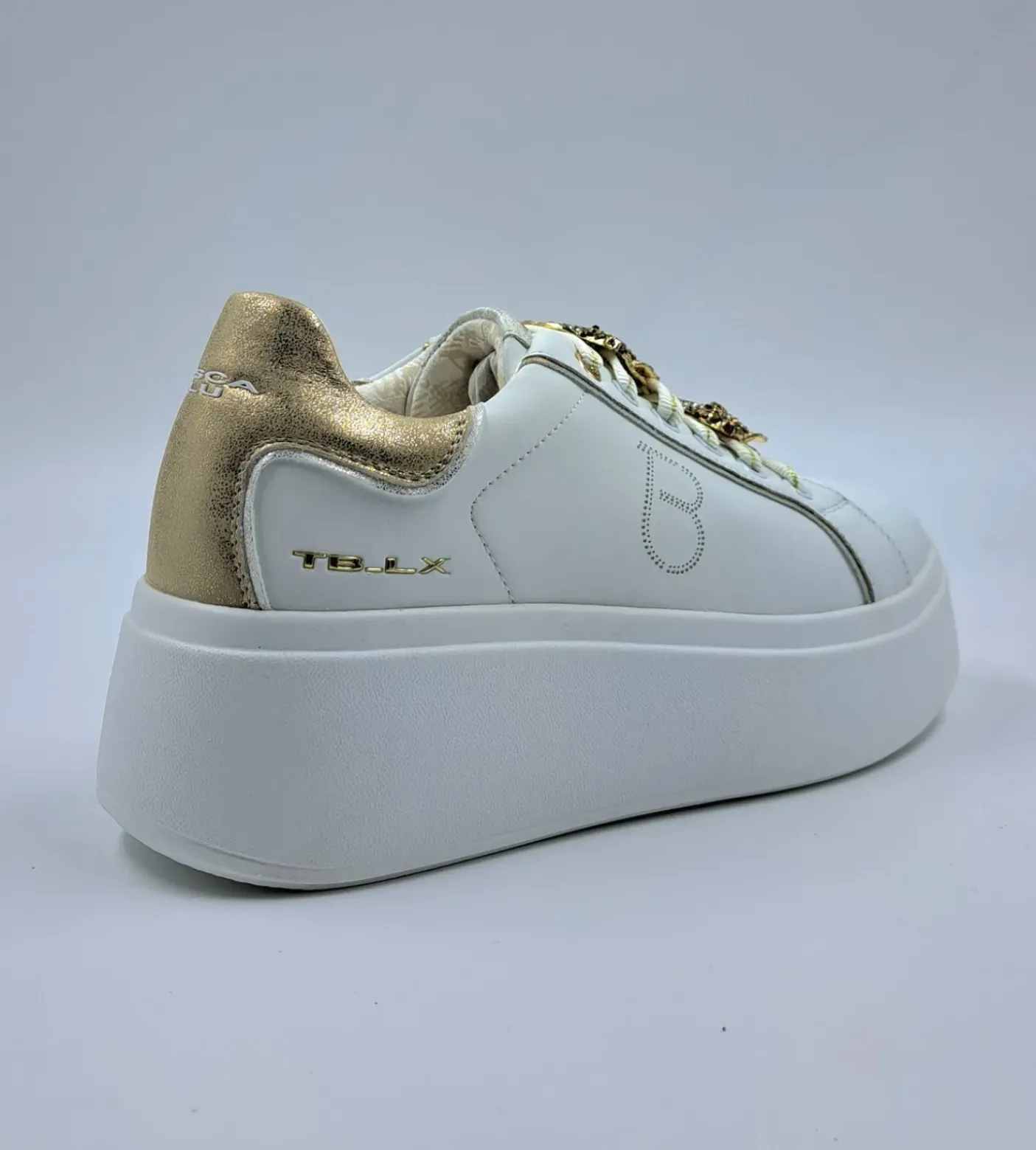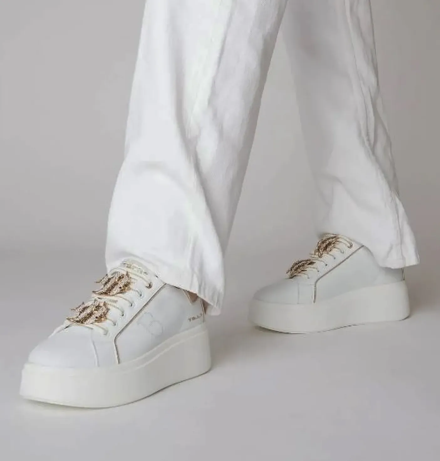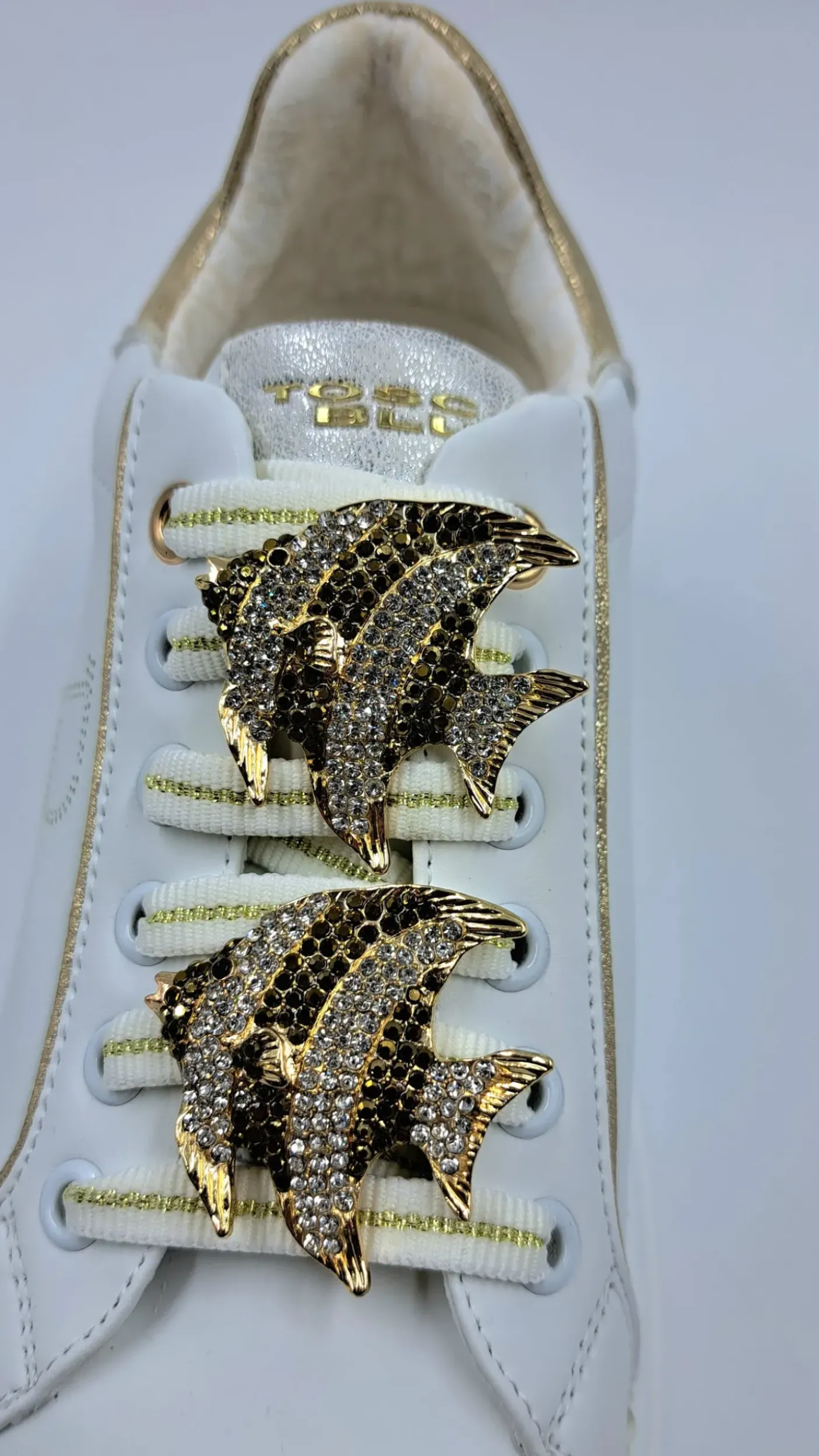 Sneakers in vera pelle, rivestita internamente in pelle. Charms asportabile pesci strass bianchi neri con base metallica gold. Spoiler pelle gold lux. Dettagli gold. Chiusura con lacci. Fondo gomma 5cm