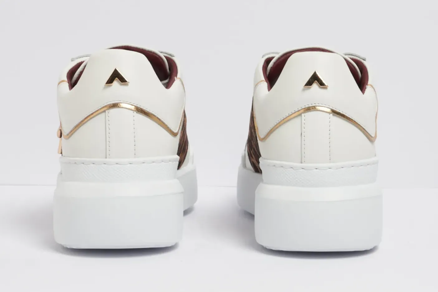 Sneakers realizzata interamente in vera pelle con dettagli in pelle stampa animalier. Logo gold. Suola oversize in gomma. Lacci in cotone. Elastico su collo piede.