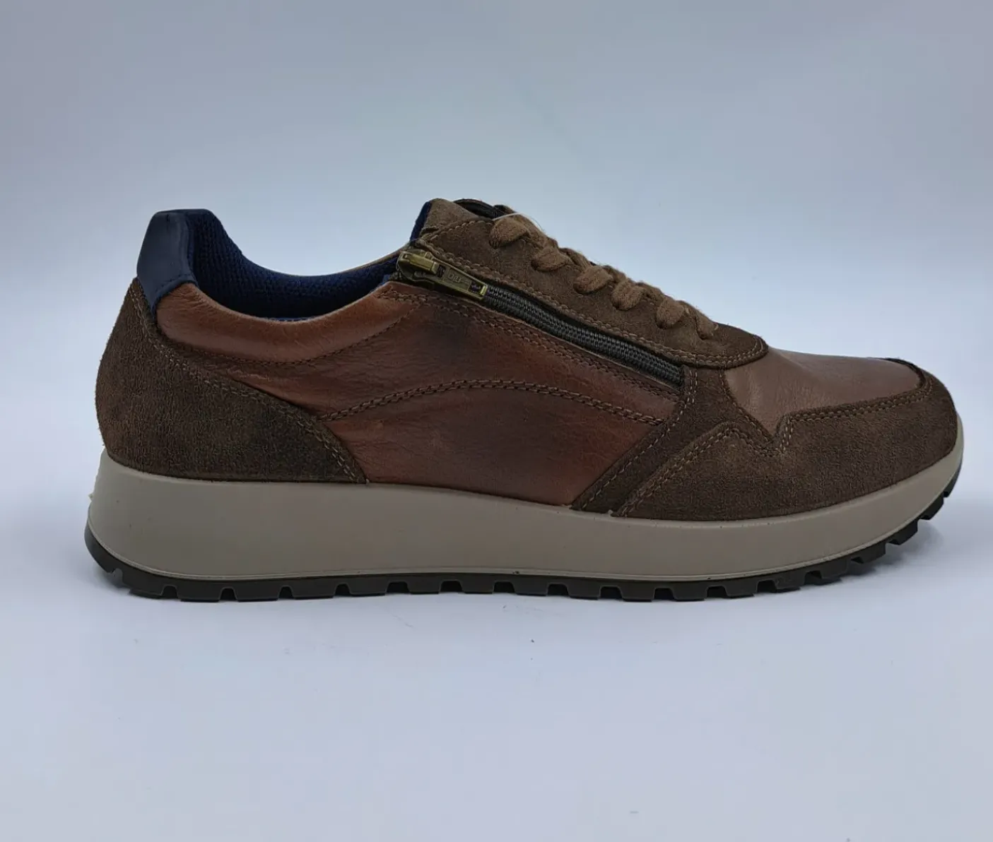 Sneakers in vera pelle e camoscio, rivestita internamente con fodera tessuto caldo traspirante. Plantare in vera pelle anatomico estraibile. Chiusura con lacci e zip laterale. Fondo leggero in flessibile PU. Collarino imbottito e contrafforte di sostegno.