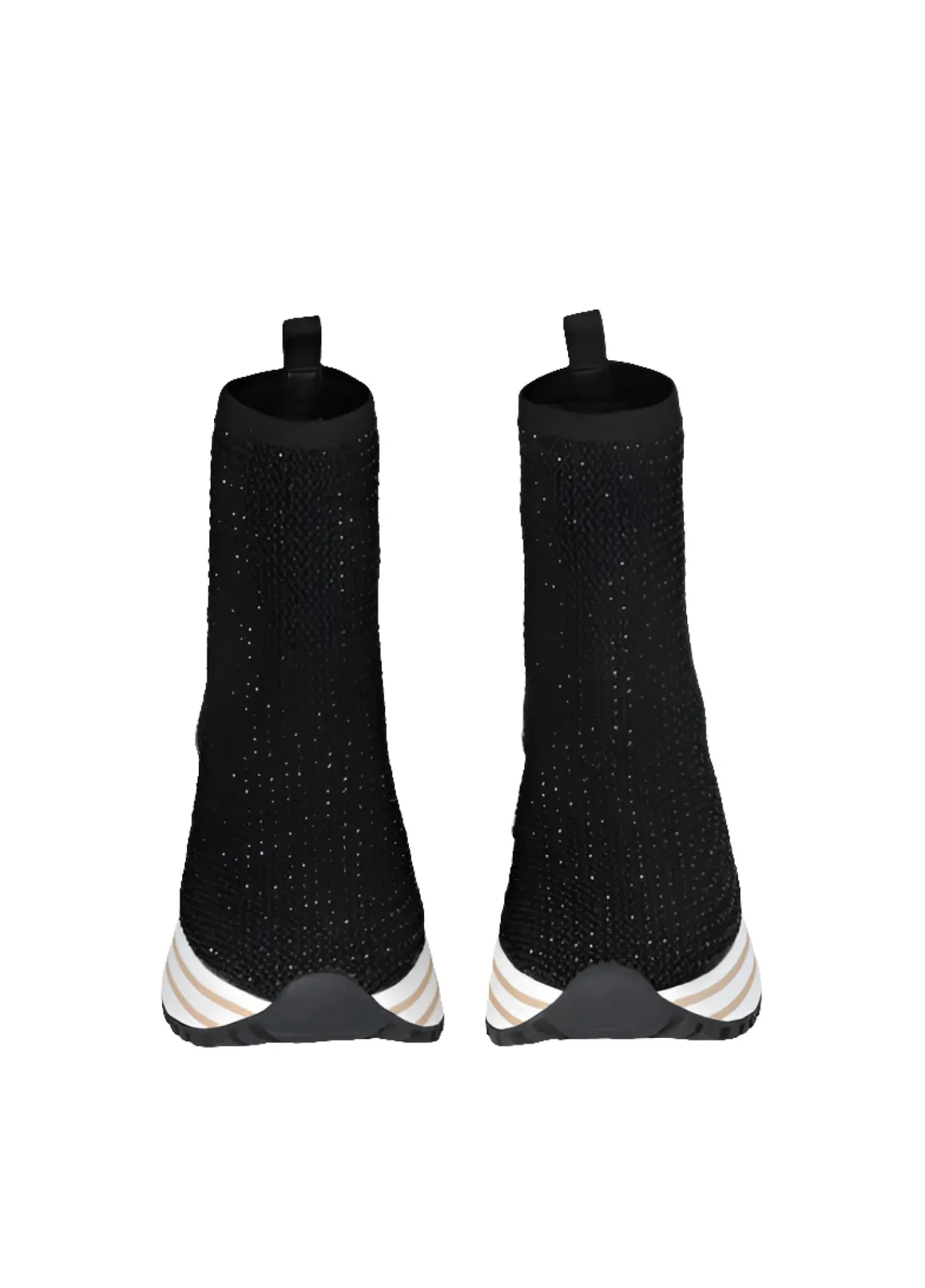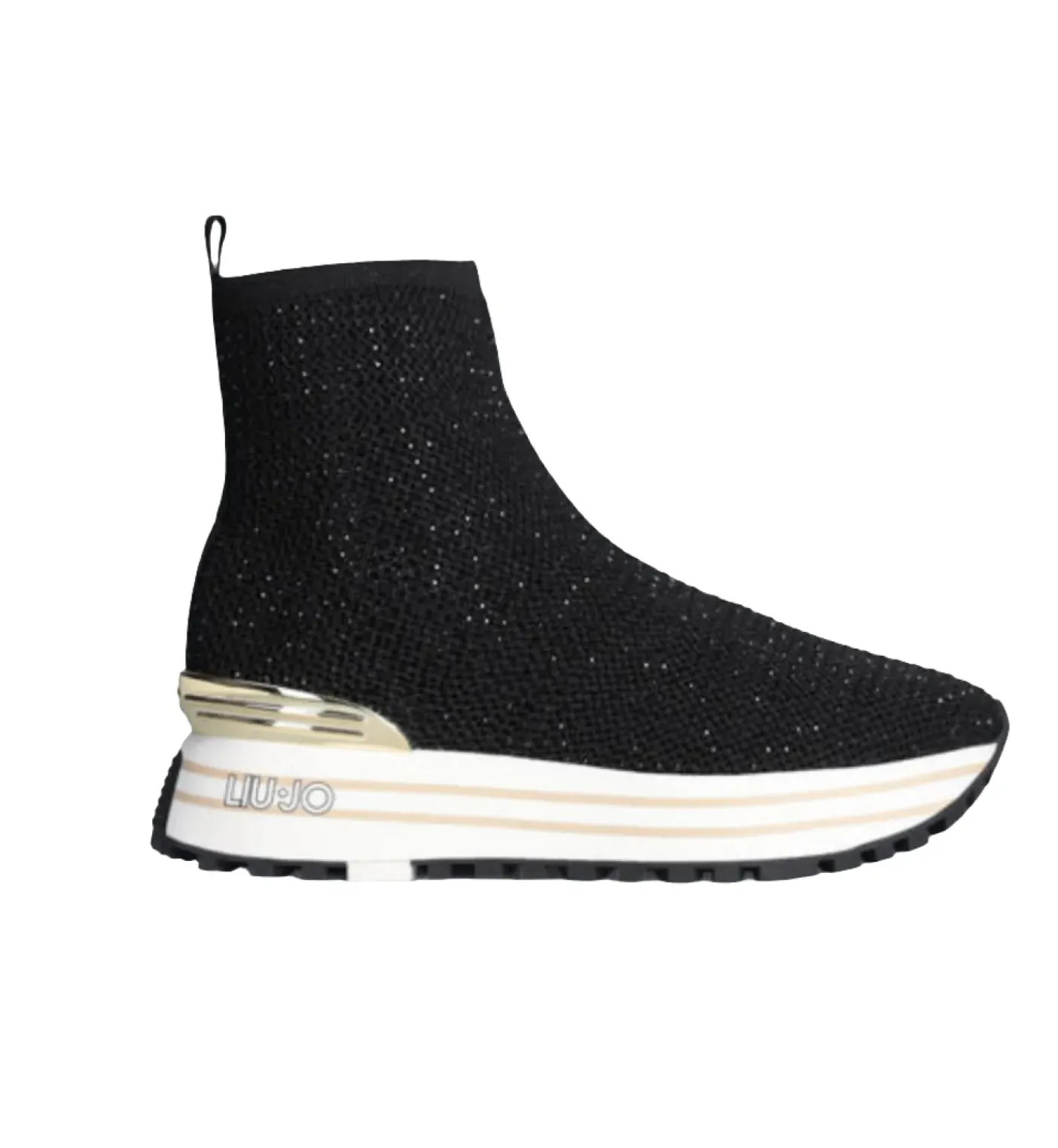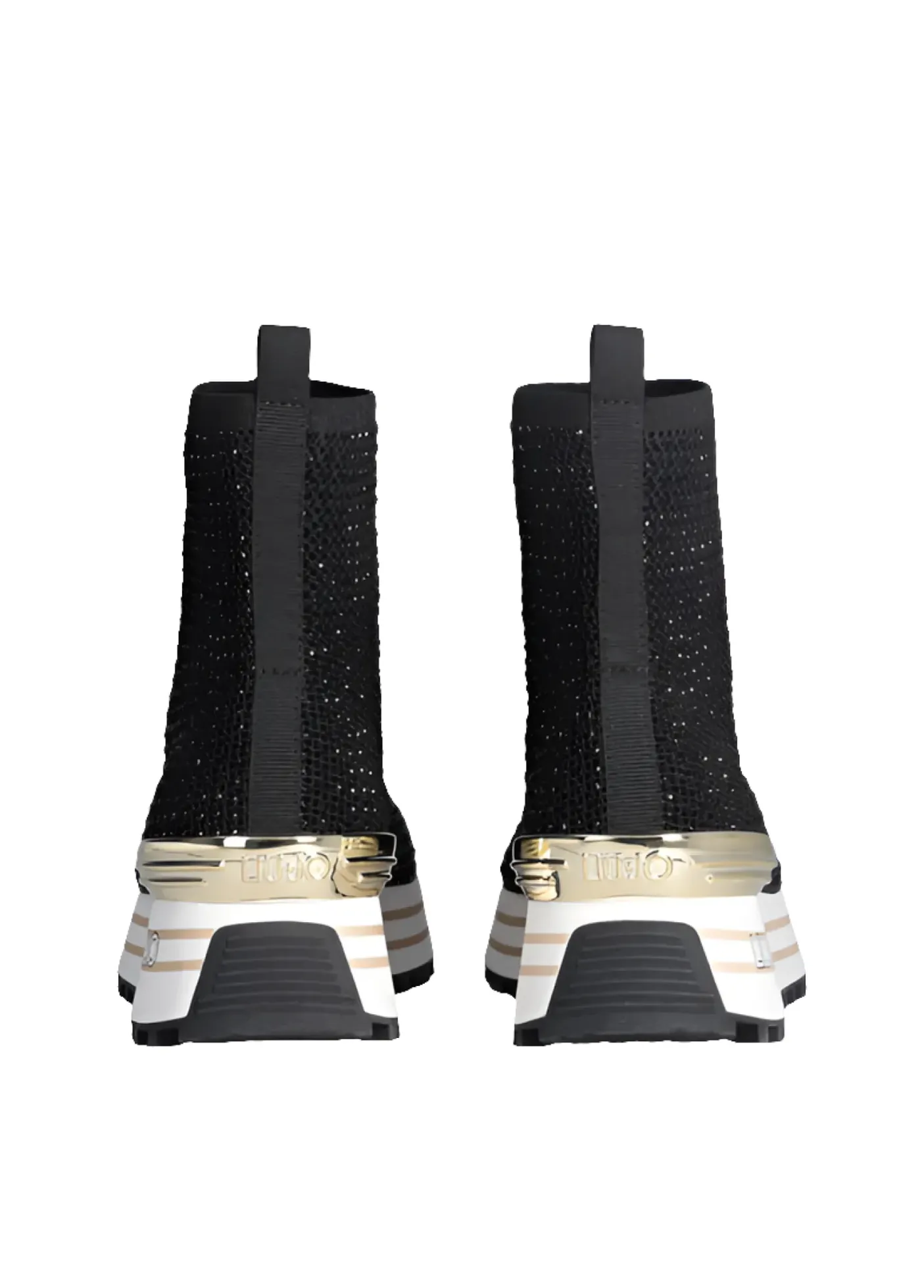Sneakers in tessuto elasticizzato con micro strass neri, spoiler effetto metallizzato oro. Fondo platform con logo stampato, battistrada dentellato in gomma.