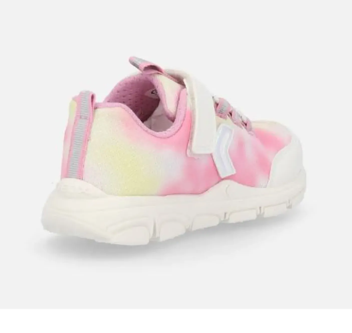 Sneakers modello running, in mesh stampato brillante e materiale ecopelle. Chiusura a strappo e lacci elastici. Soletta tessuto estraibile. Fondo gomma con brevetto Geox Respira.