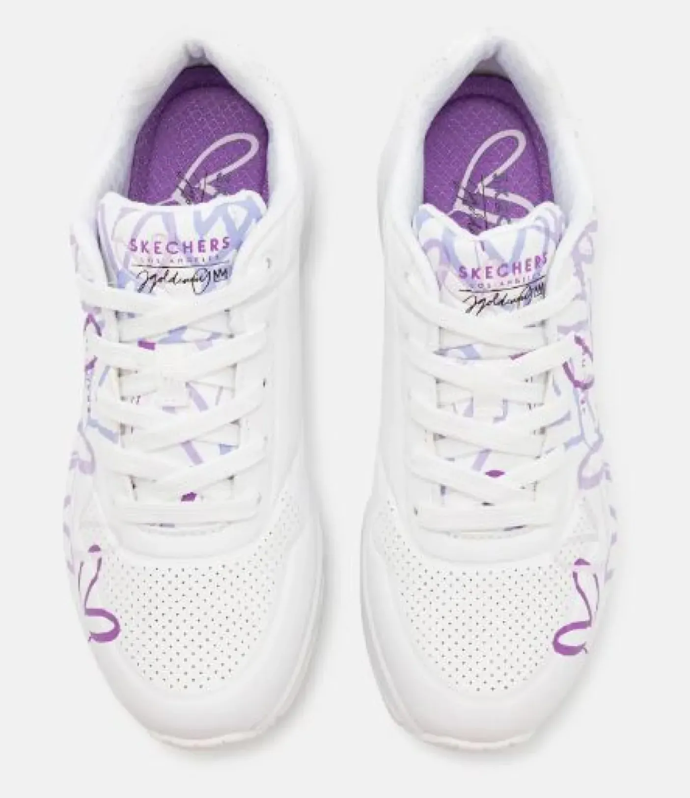 Sneakers ultra leggera in durabuck tecnico traforata decorazione cuori lavanda e porpora, sottopiede in memory foam e air cooled. Intersuola ammortizzata ad aria con tecnologia visibile Skech-Air®. Fondo in gomma 3 cm e chiusura con lacci.