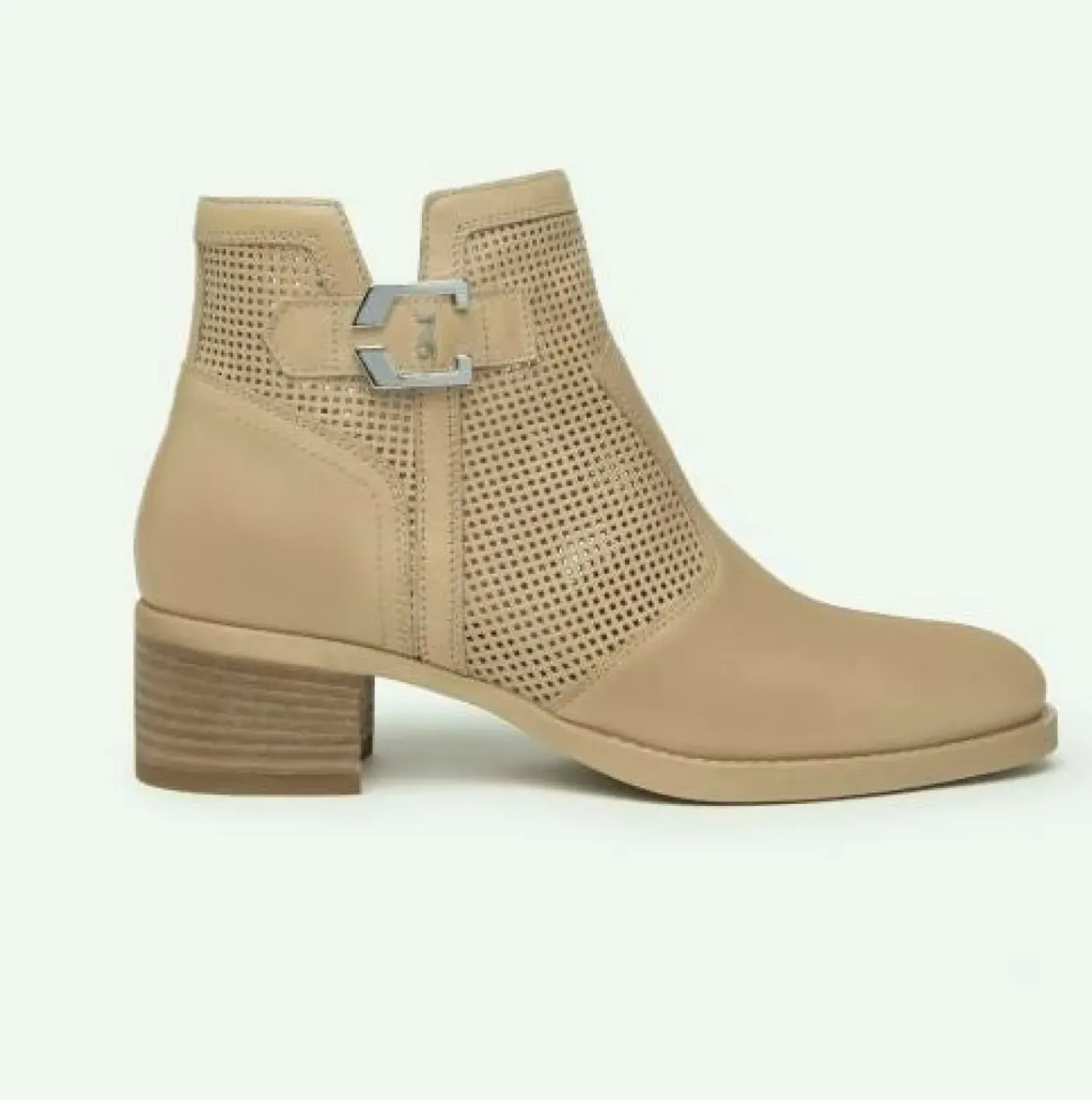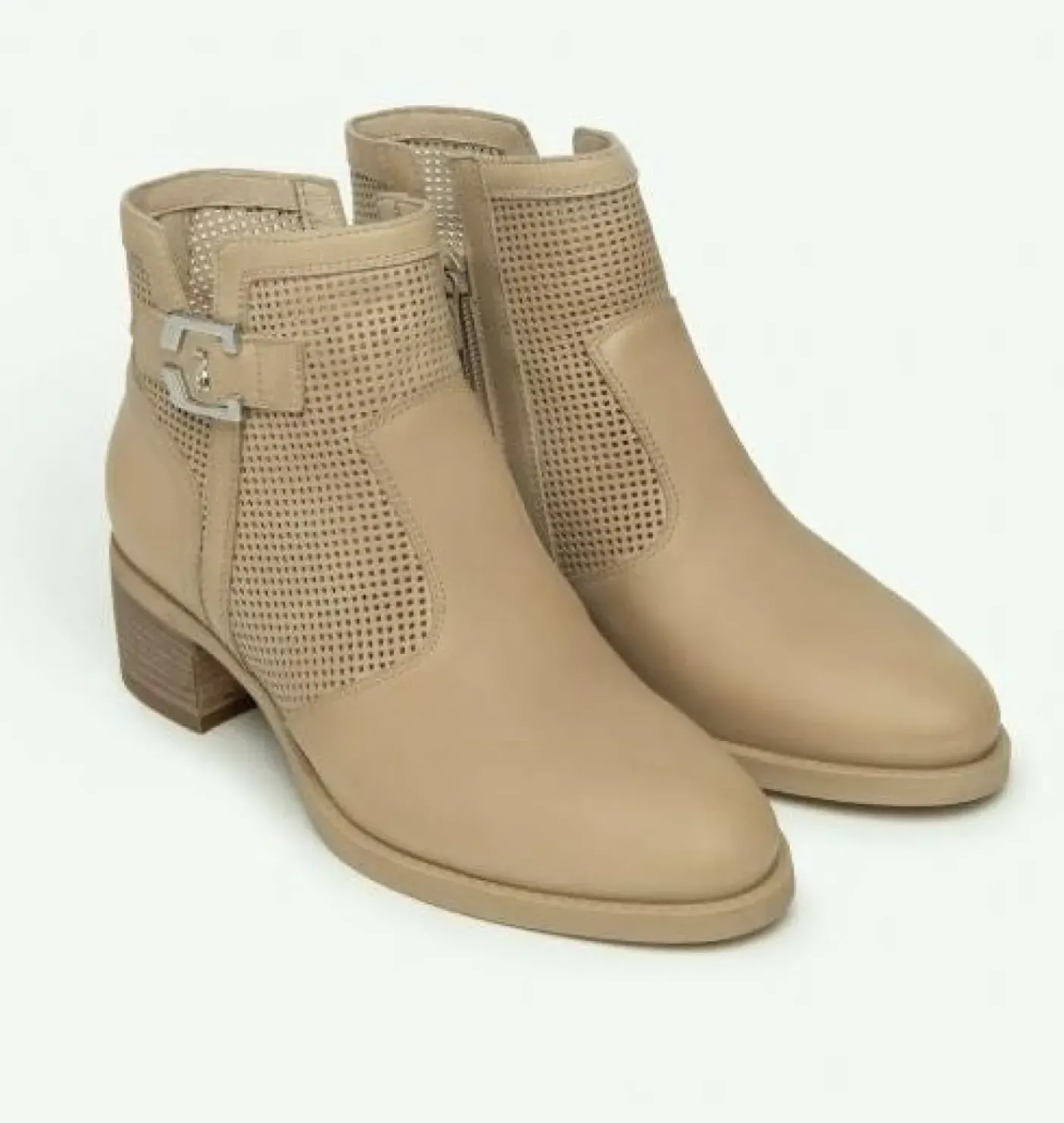 Stivaletti in pelle e pelle traforata. Chiusura laterale con zip. Rivestito internamente in pelle. Tacco 4cm. Logo metallico laterale.
