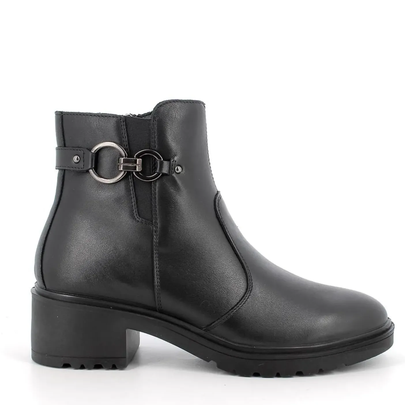 Stivaletti in pelle rivestiti internamente in tessuto. Applicazione metallica laterale. Chiusura con zip laterale. Soletta in pelle estraibile.