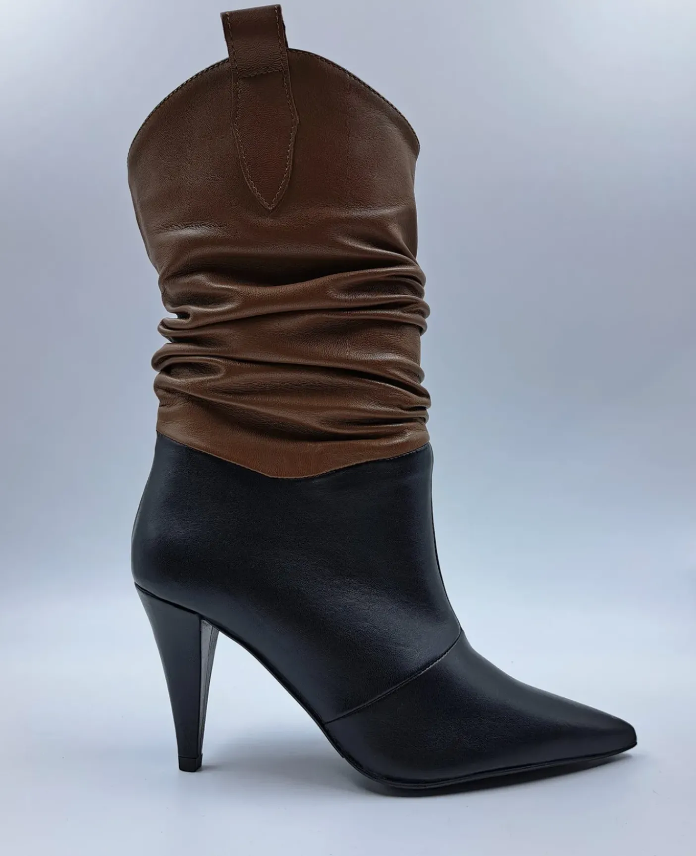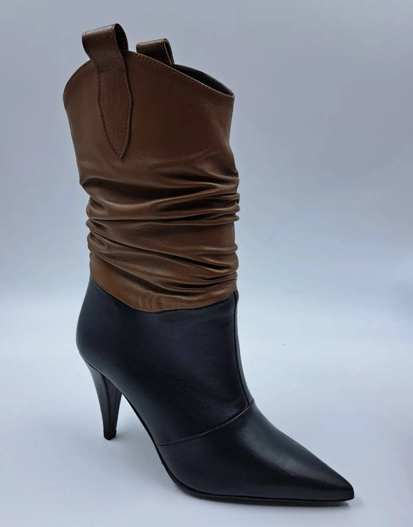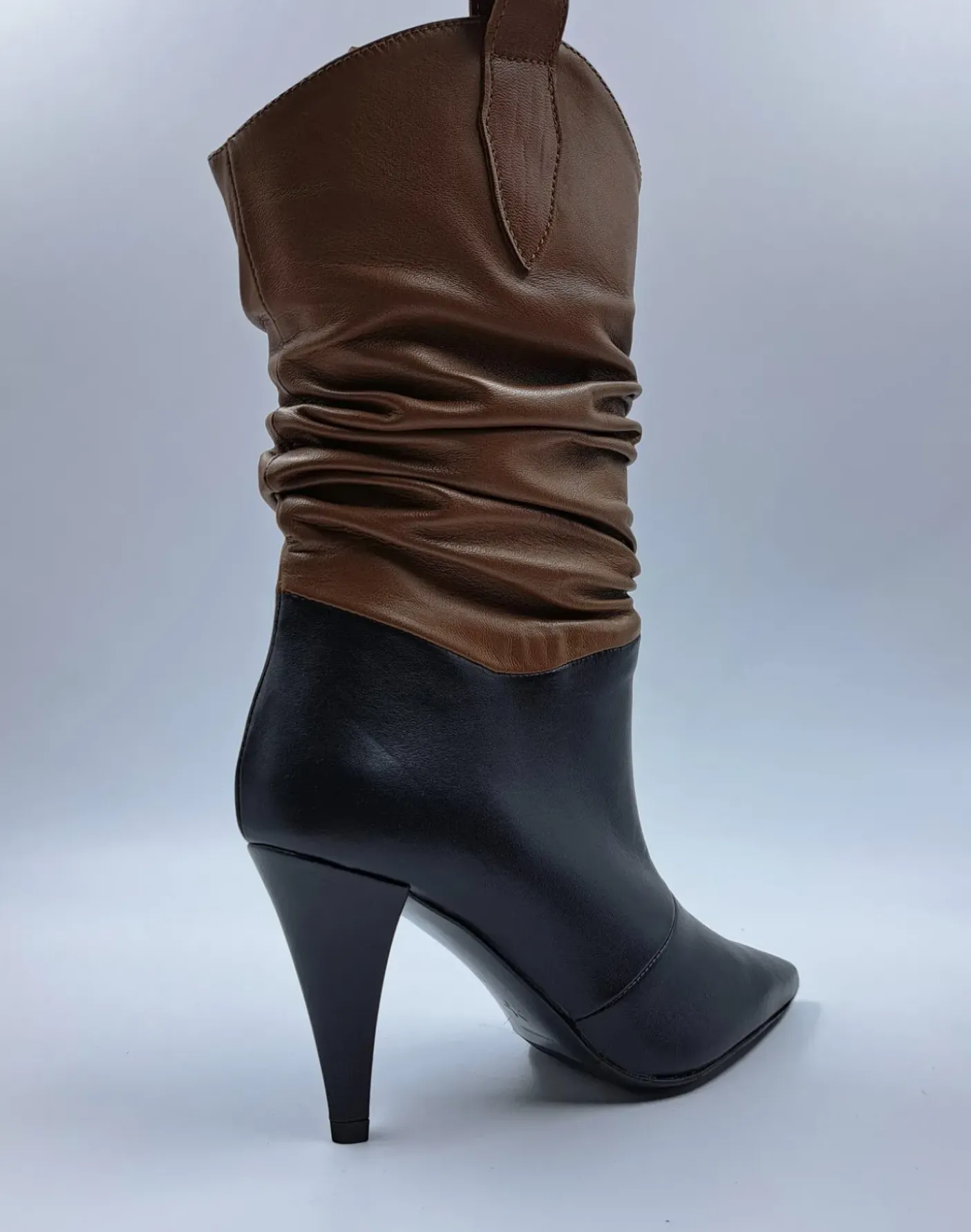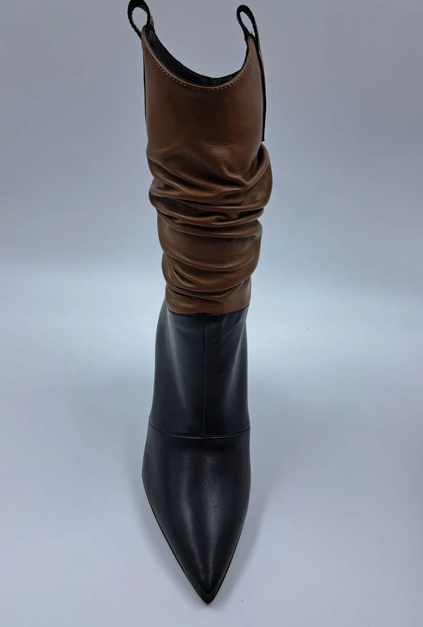 Stivaletti in vera pelle morbida color cuoio e nero. Gambale in pelle effetto piegato. Rivestito internamente in pelle. Tacco rivestito in pelle nera 8,5cm. Gambale 23cm.