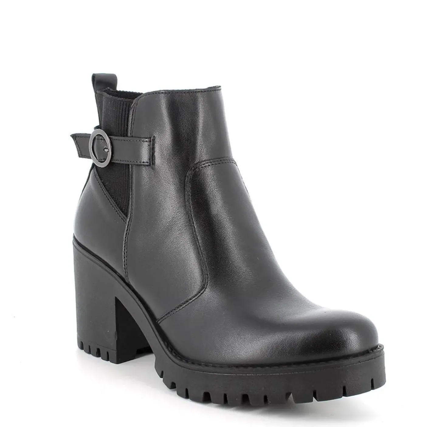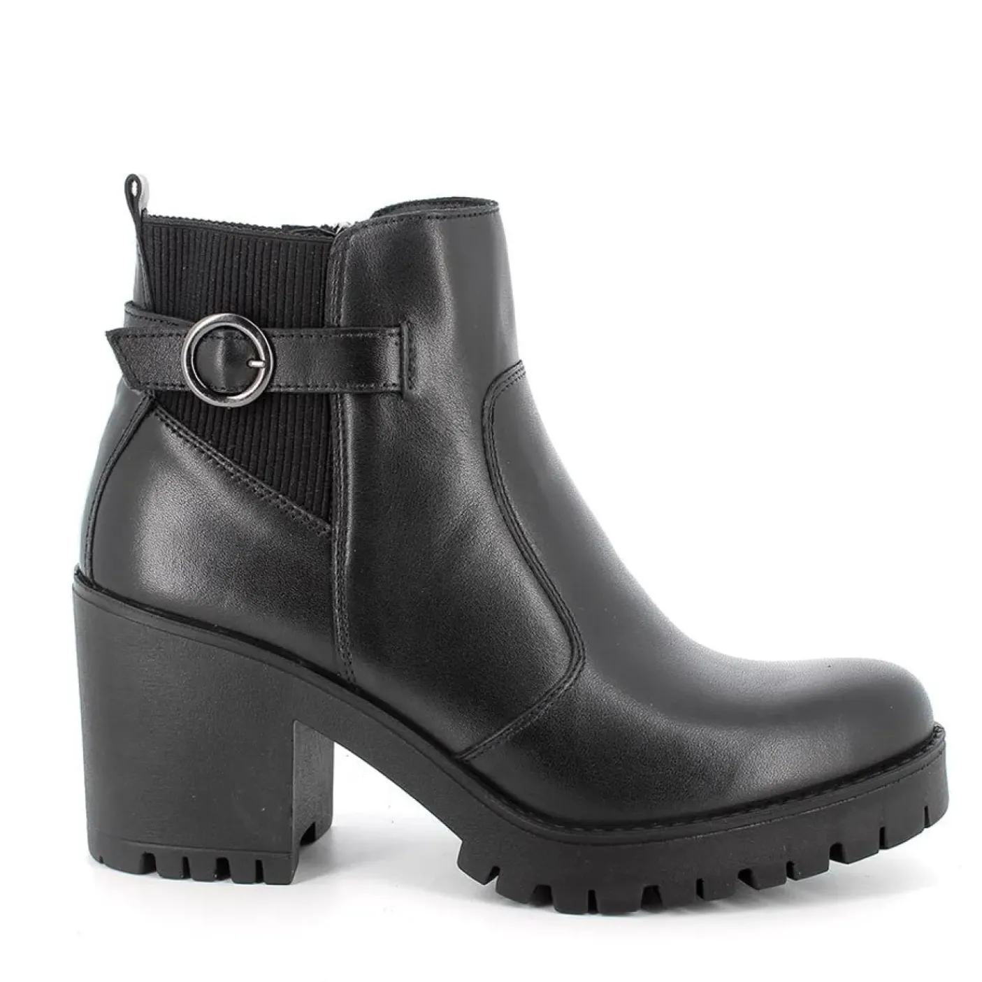 Stivaletto in morbida pelle nera, rivestito internamente in pelle. Elastico laterale e fibbia decorativa. Soletta estraibile. Chiusura con zip. Fondo gomma 8cm