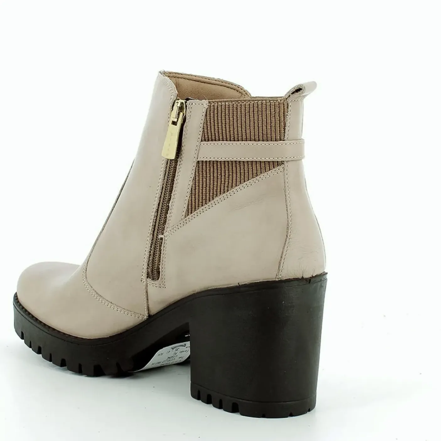 Stivaletto in pelle ed elastico. Applicazione metallica laterale. Rivestito internamente in tessuto. Soletta in pelle estraibile. Chiusura con zip laterale. Fondo gomma 8cm. Gambale 9/10cm.