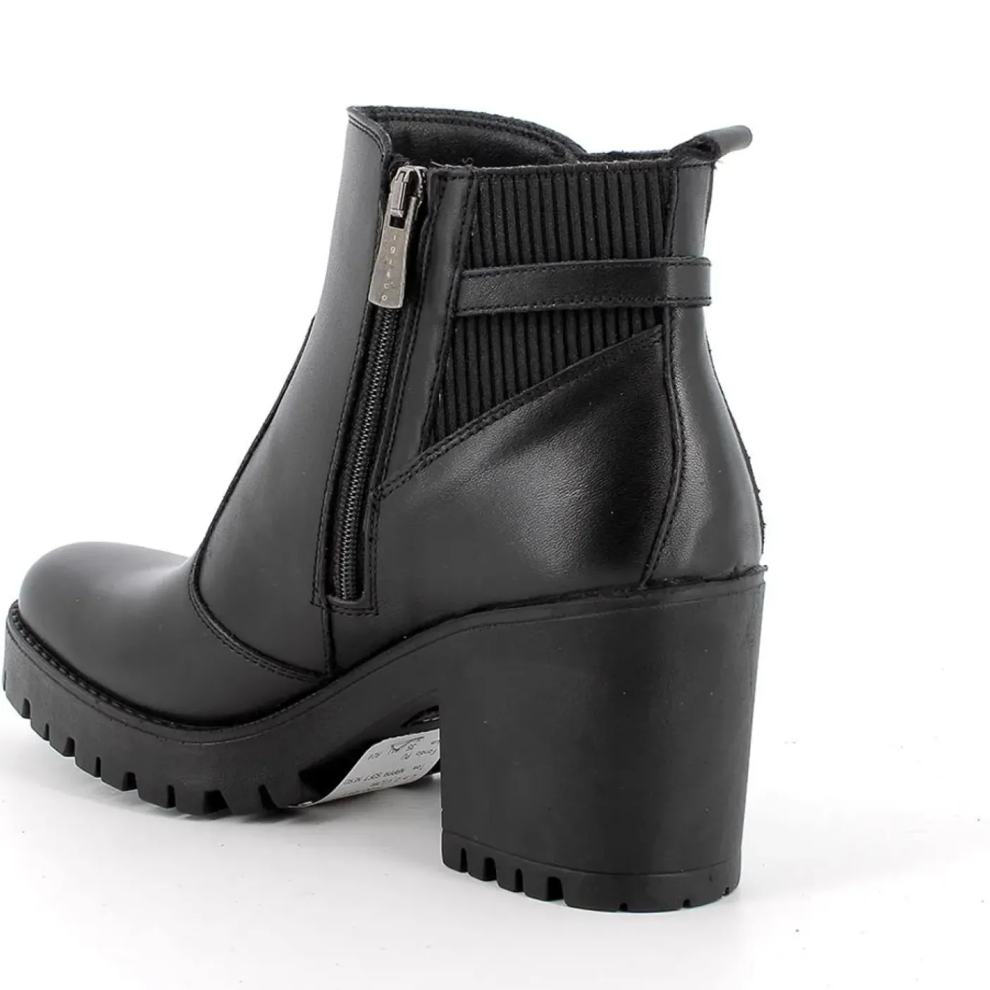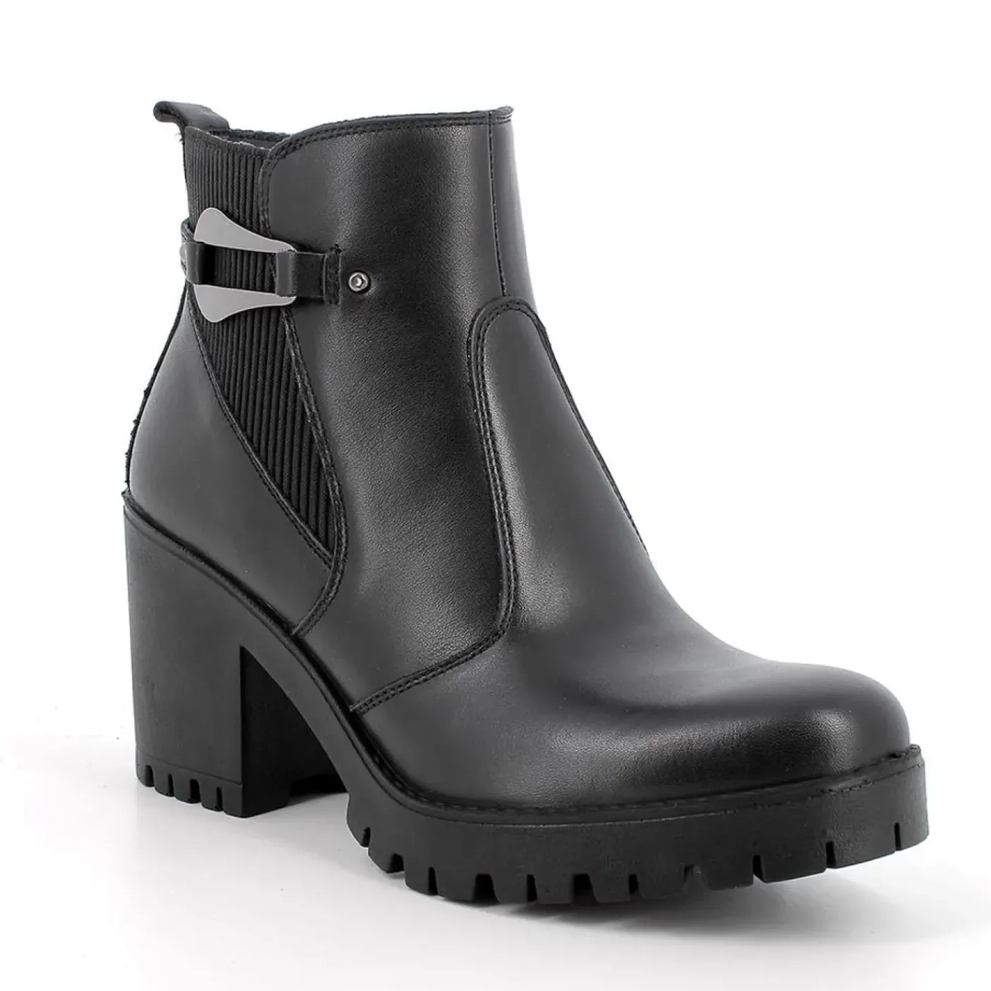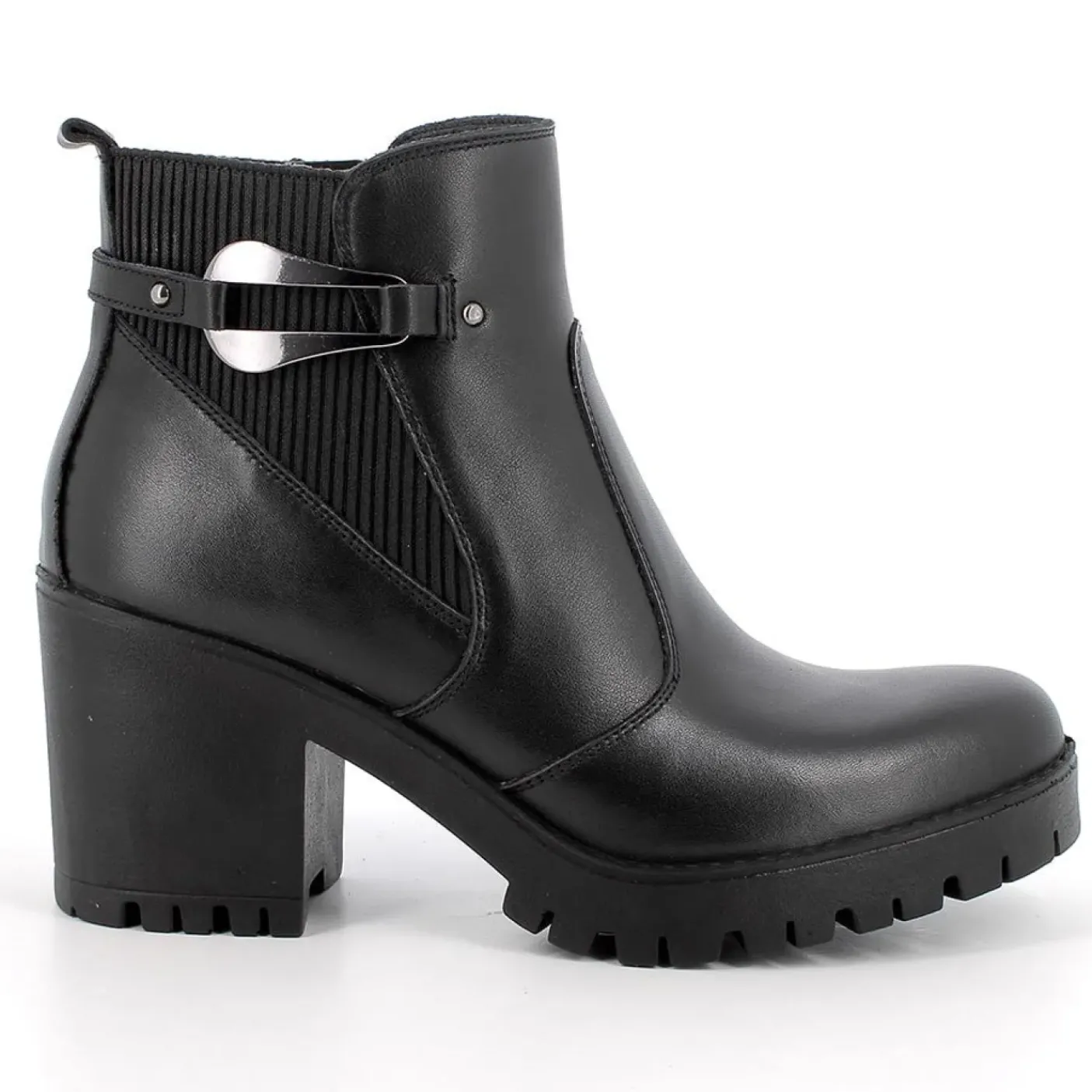 Stivaletto in pelle ed elastico. Applicazione metallica laterale. Rivestito internamente in tessuto. Soletta in pelle estraibile. Chiusura con zip laterale. Fondo gomma 8cm. Gambale 9/10cm.