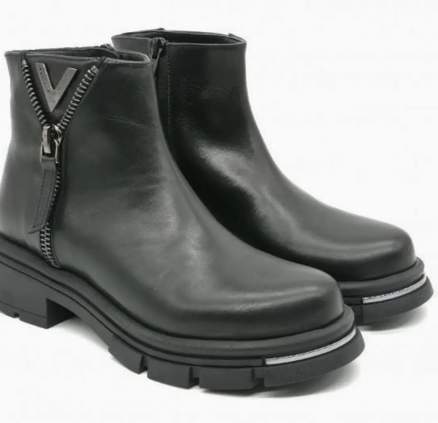 Stivaletti in vera pelle, rivestito internamente in pelle. Applicazione zip e logo laterale decorativi. Fondo gomma 4,5cm con applicazione metallica anteriore. Gambale 12cm
