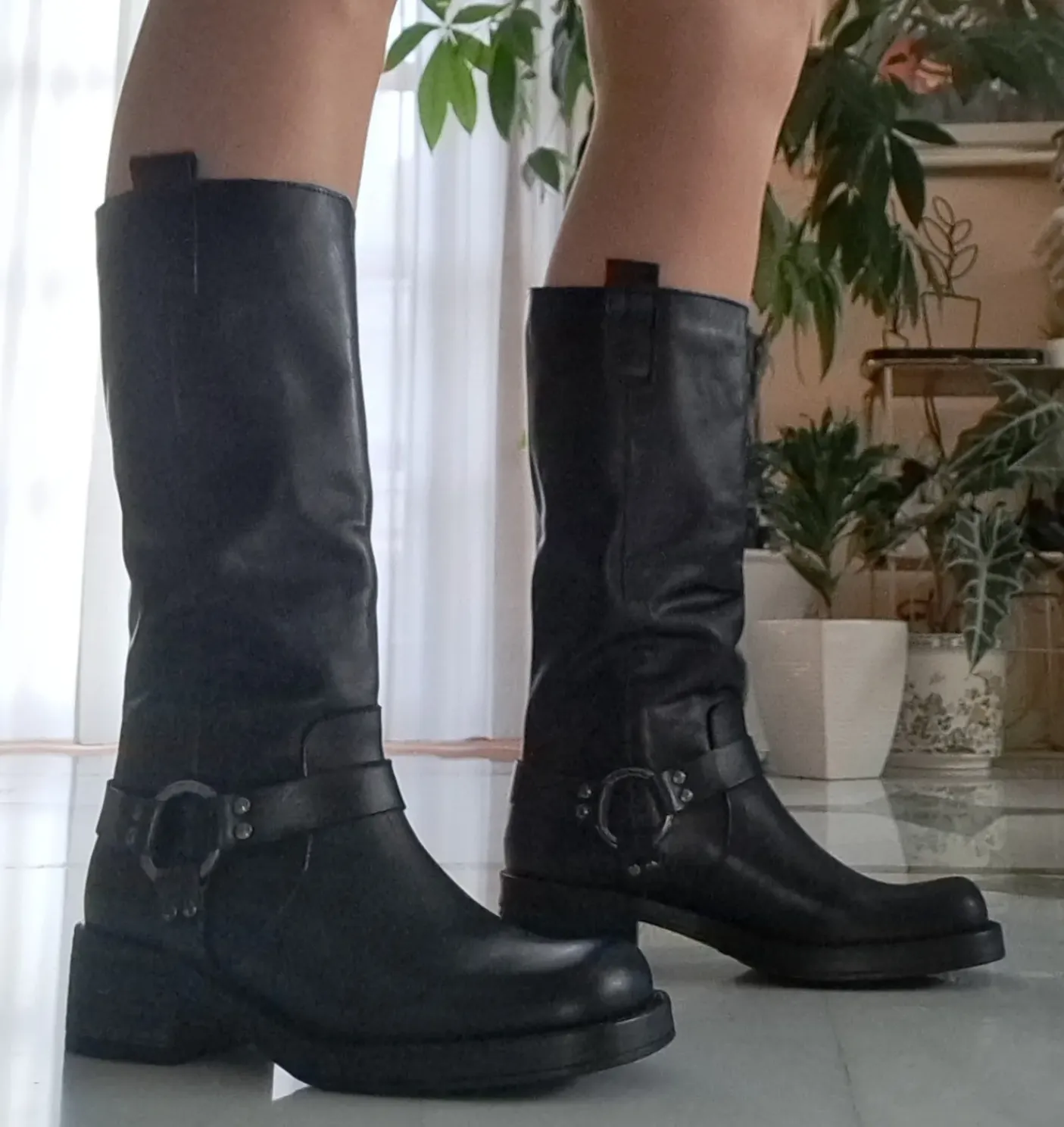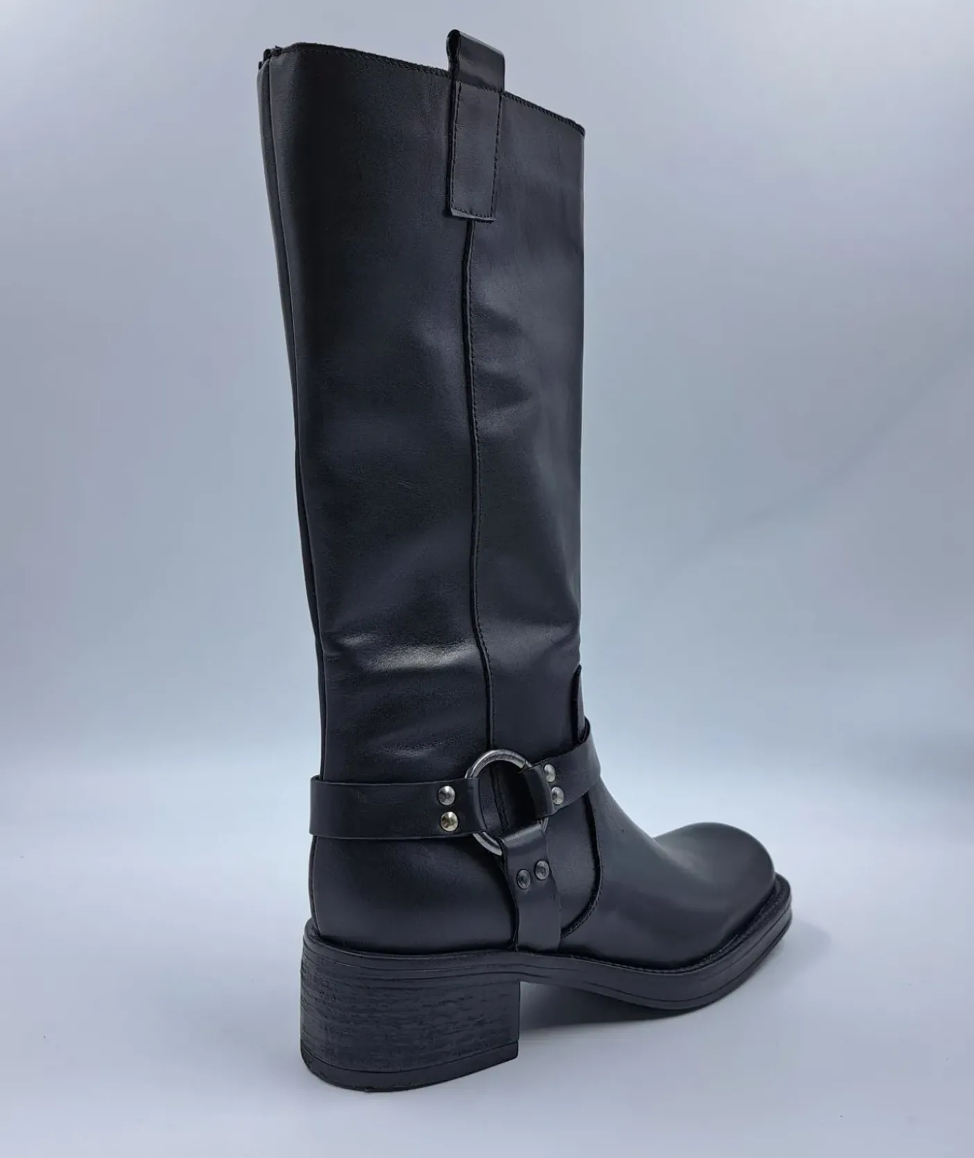 Stivali in pelle morbida modello biker. Anello metallico laterale. Punta squadrata. Gambale (misura dal tallone) 30cm. Fondo gomma tacco 4,5cm.