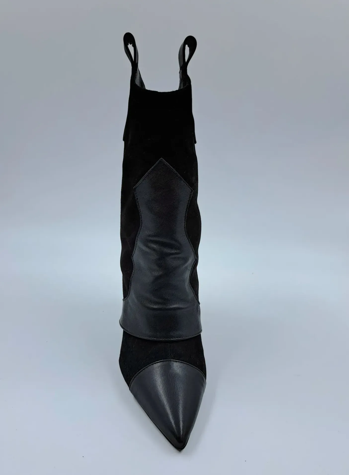 Stivali in vera pelle e camoscio con risvolto. Rivestito internamente in pelle. Soletta in pelle. Tacco a spillo rivestito 9cm.