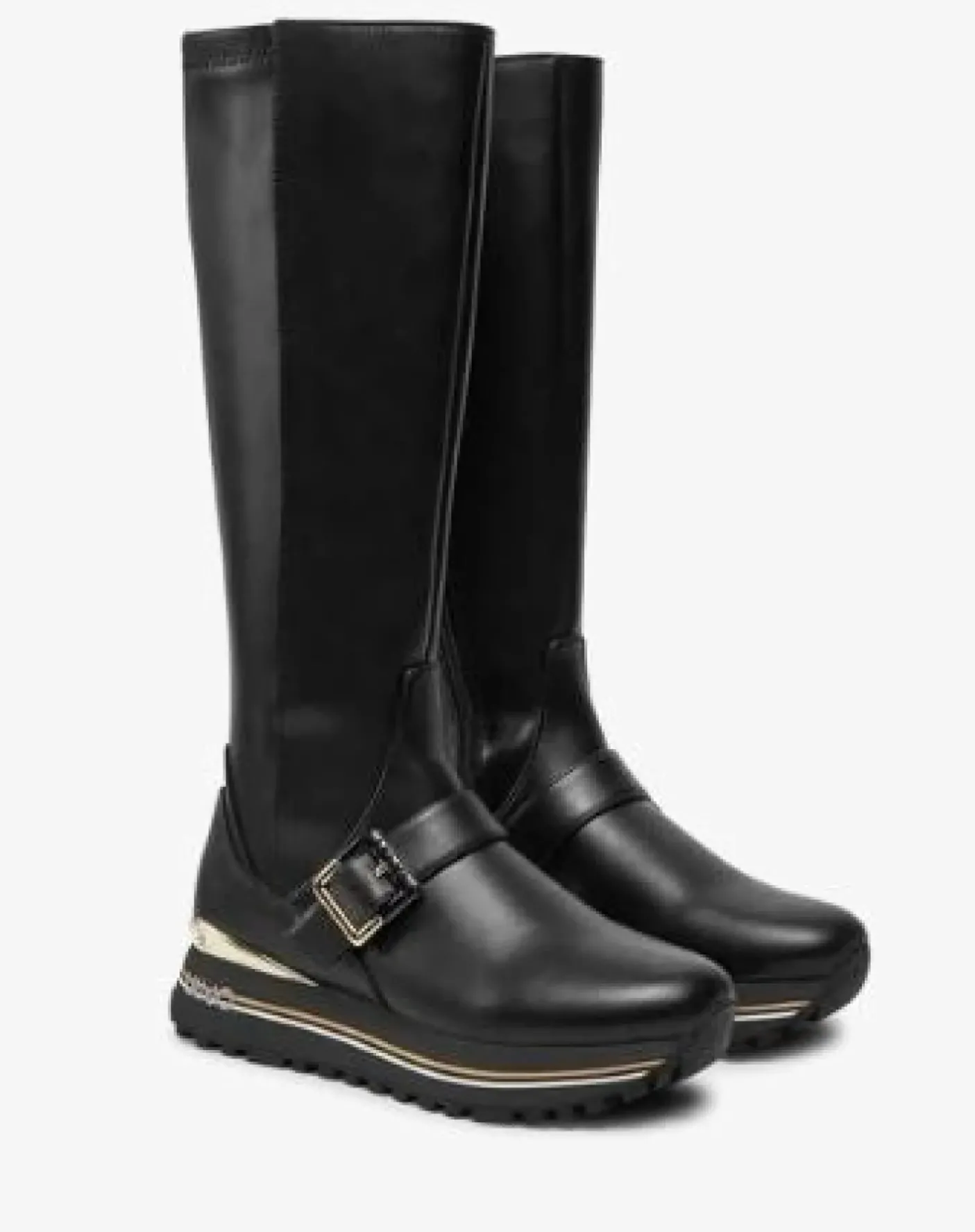 Stivali in ecopelle con applicazione fibbia decorativa. Applicazione metallica posteriore gold. Chiusura con zip. Fondo gomma e 3,5cm
