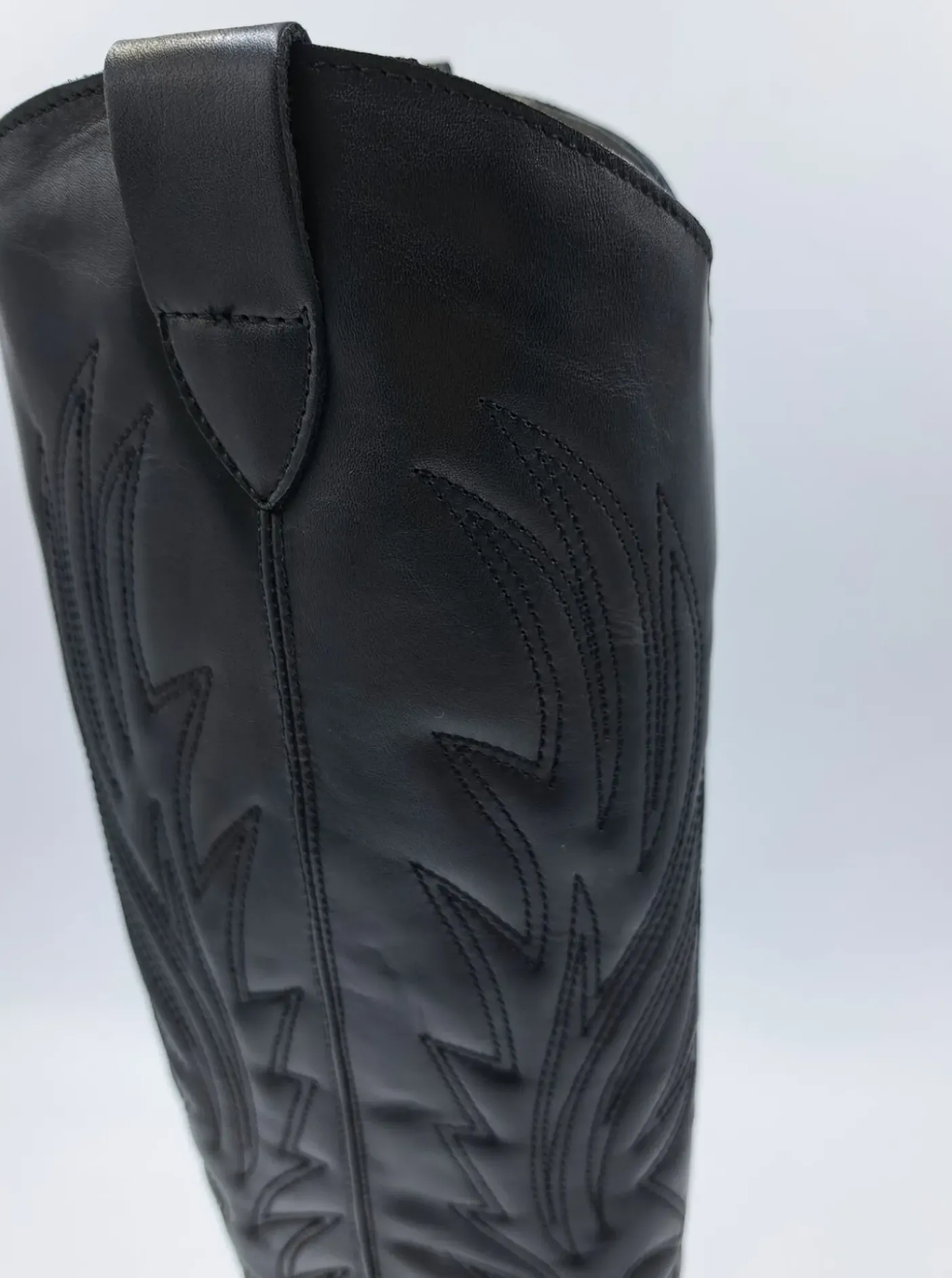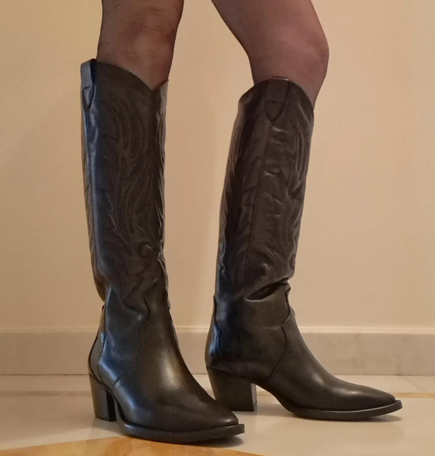 Stivali in vera pelle morbida con ricami. Rivestito internamente in vera pelle. Tacco 5cm. Gambale 40/43cm. Tiranti laterali decorativi.