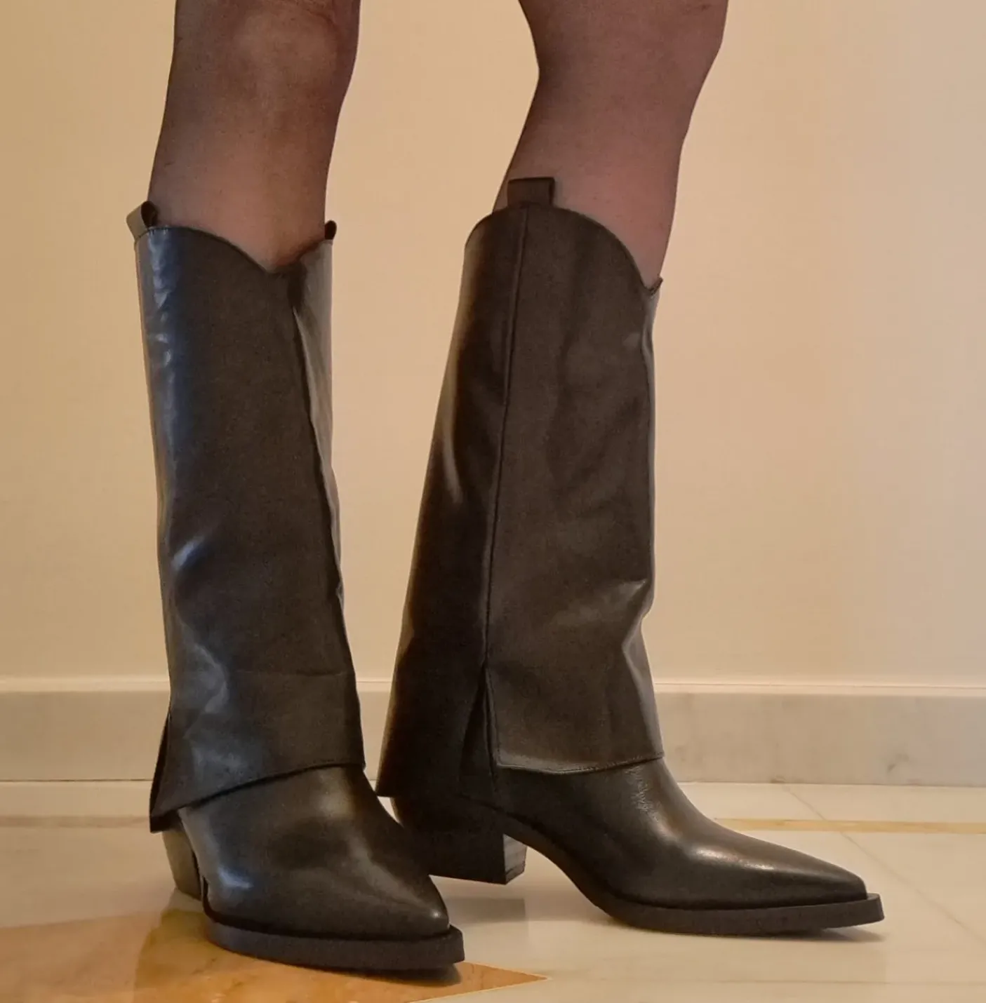 Stivali in vera pelle con risvolto in pelle. Rivestito internamente in vera pelle. Tacco 5cm. Gambale 30cm
