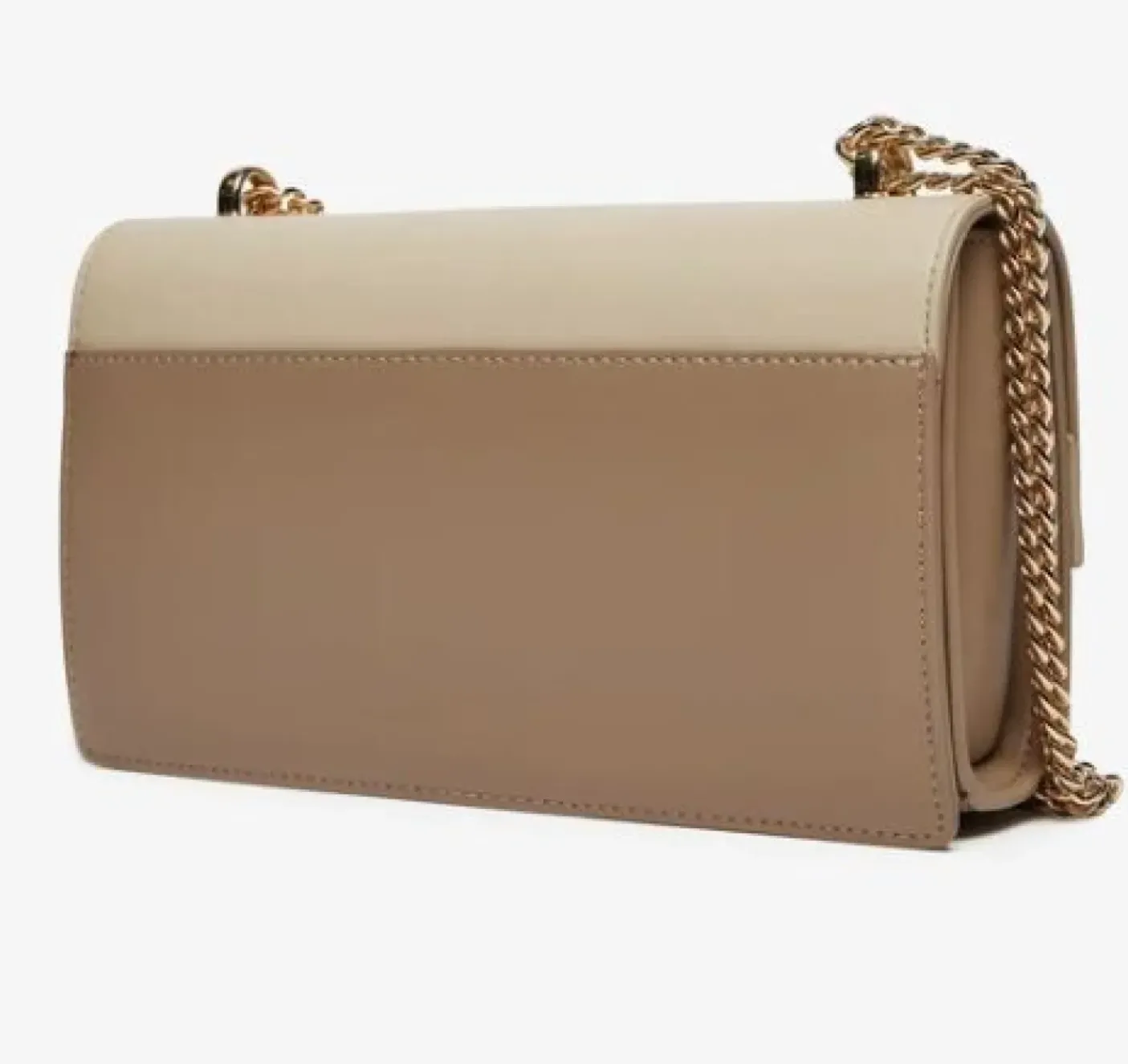Tracolla in ecopelle. Tasca interna portaoggetti. Logo frontale metallo. Chiusura con patta e zip. Tracolla catena metallo e inserti ecopelle.