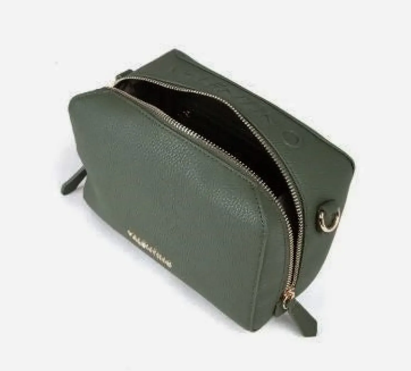Tracolla in ecopelle logo metallico frontale e in rilievo. Tasca interna portaoggetti. Chiusura zip. Tracolla tessuto logato regolabile.