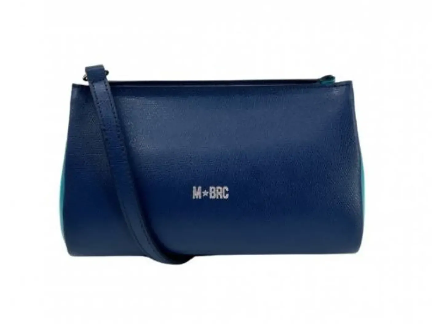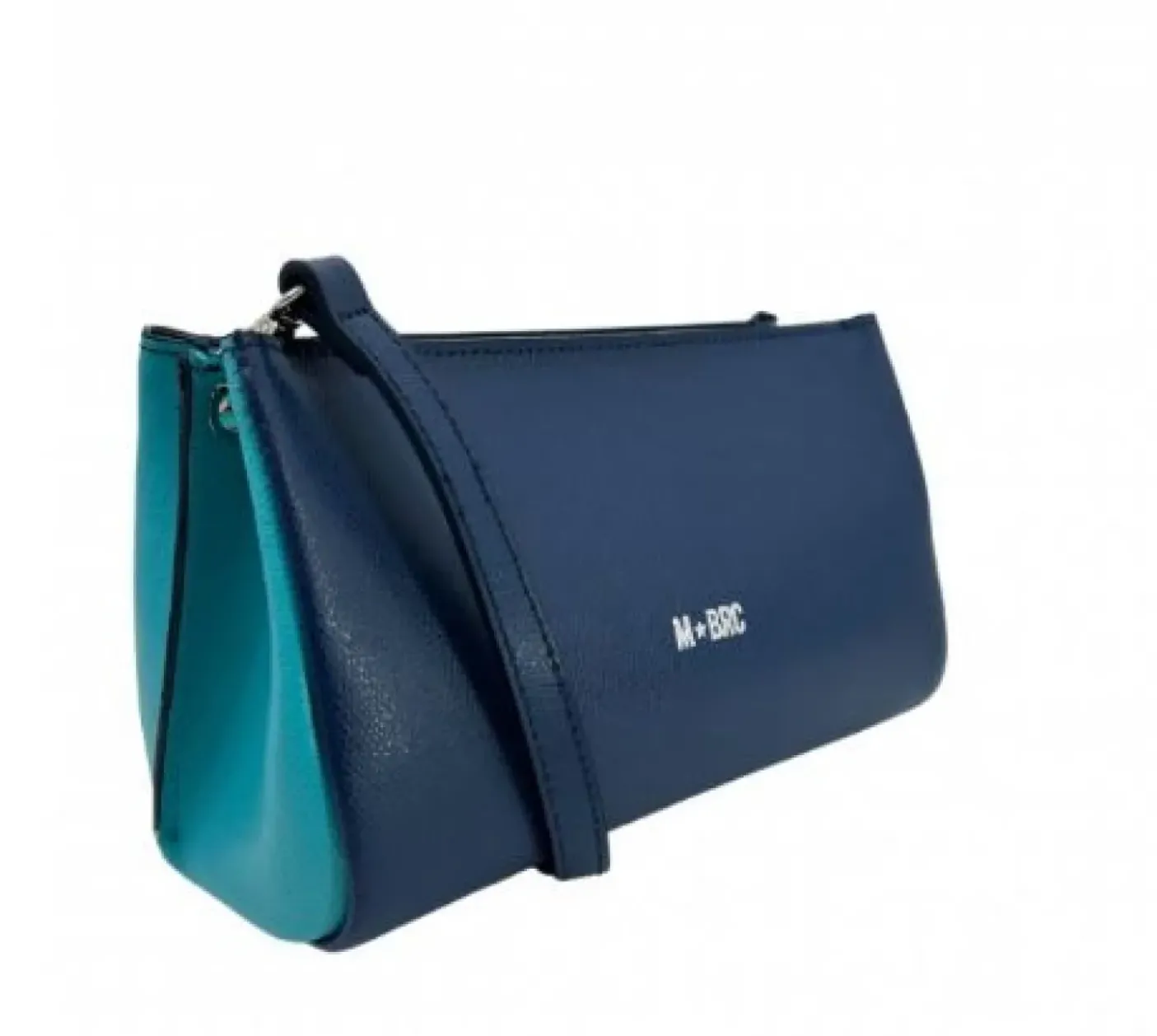 Tracolla in vera pelle blu e celeste. Chiusura con zip. Manico in pelle e tracolla in tessuto aportabile. Rivestita internamente e tasca portaoggetti con zip.