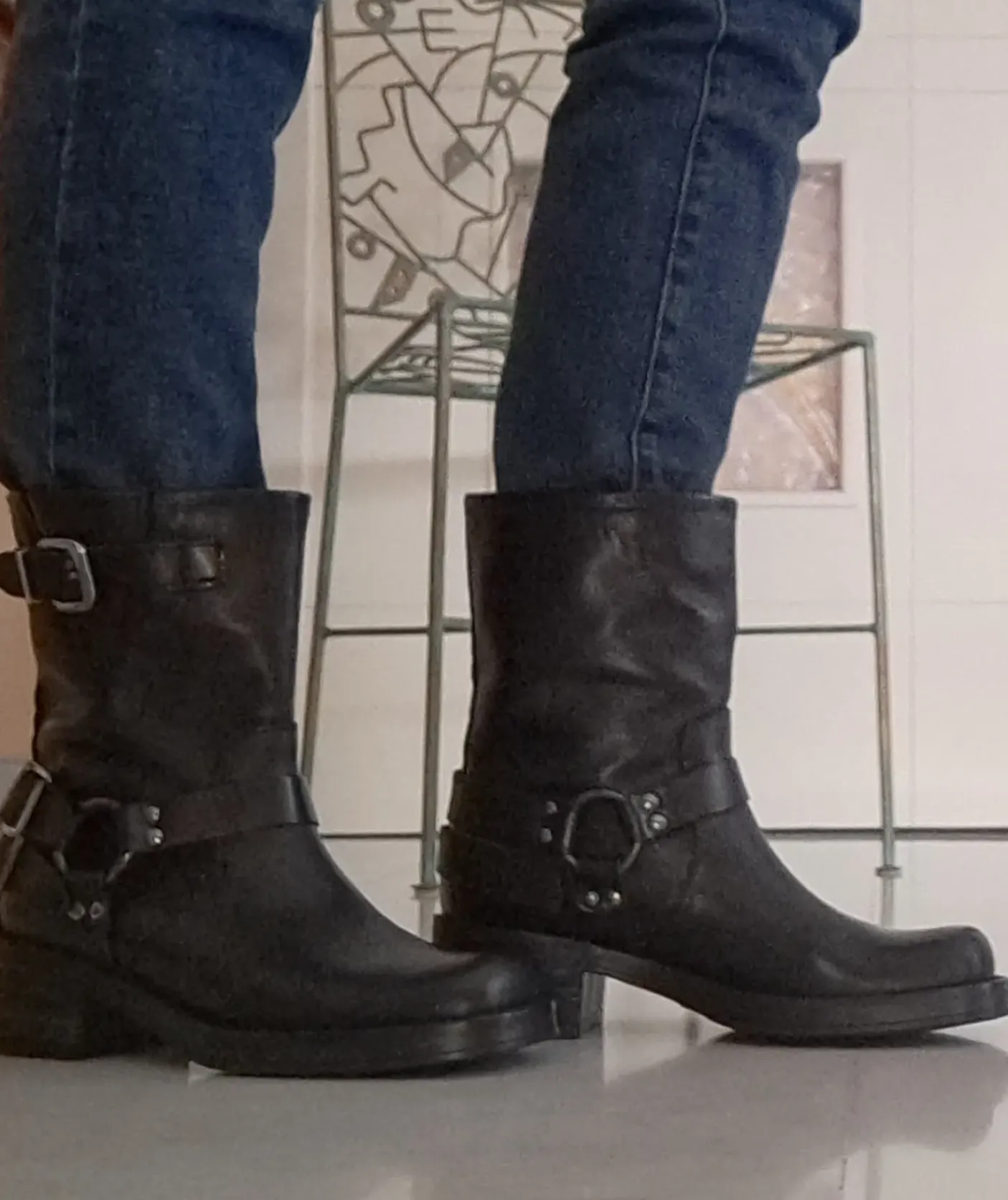 Stivali in pelle morbida modello biker. Fibbie metalliche laterali tallone. Punta squadrata. Gambale (misura dal tallone) 18cm. Fondo gomma tacco 4,5cm
