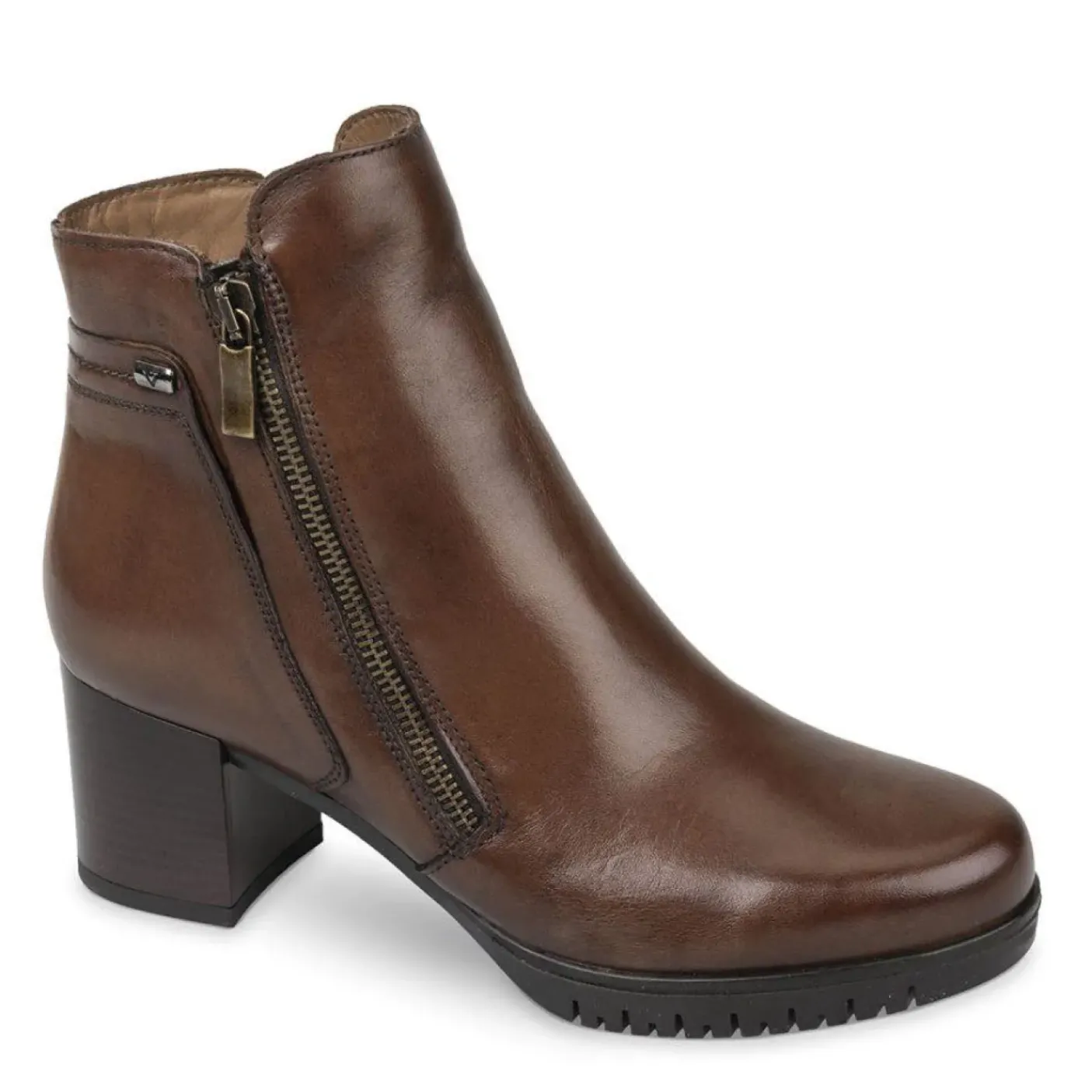 Tronchetto in pelle rivestito internamente in pelle e tessuto, chiusura con doppia zip, Fondo in gomma con tacco 6,5 cm. Comodo e flessibile.