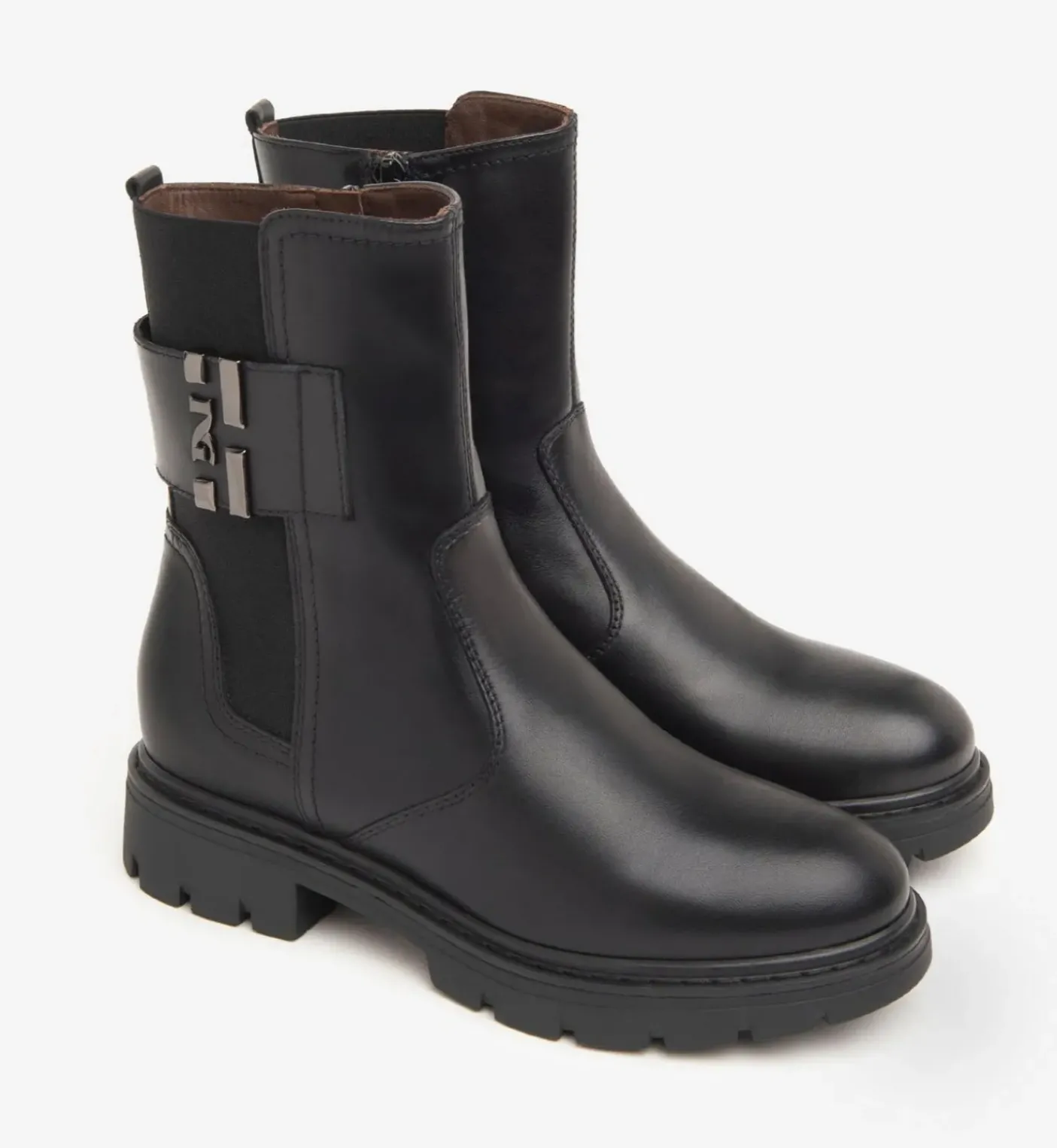 Tronchetti in vera pelle rivestito internamente in pelle. Elastico posteriore e fascia pelle con logo metallico laterale. Soletta in pelle. Chiusura zip. Fondo gomma 3cm.