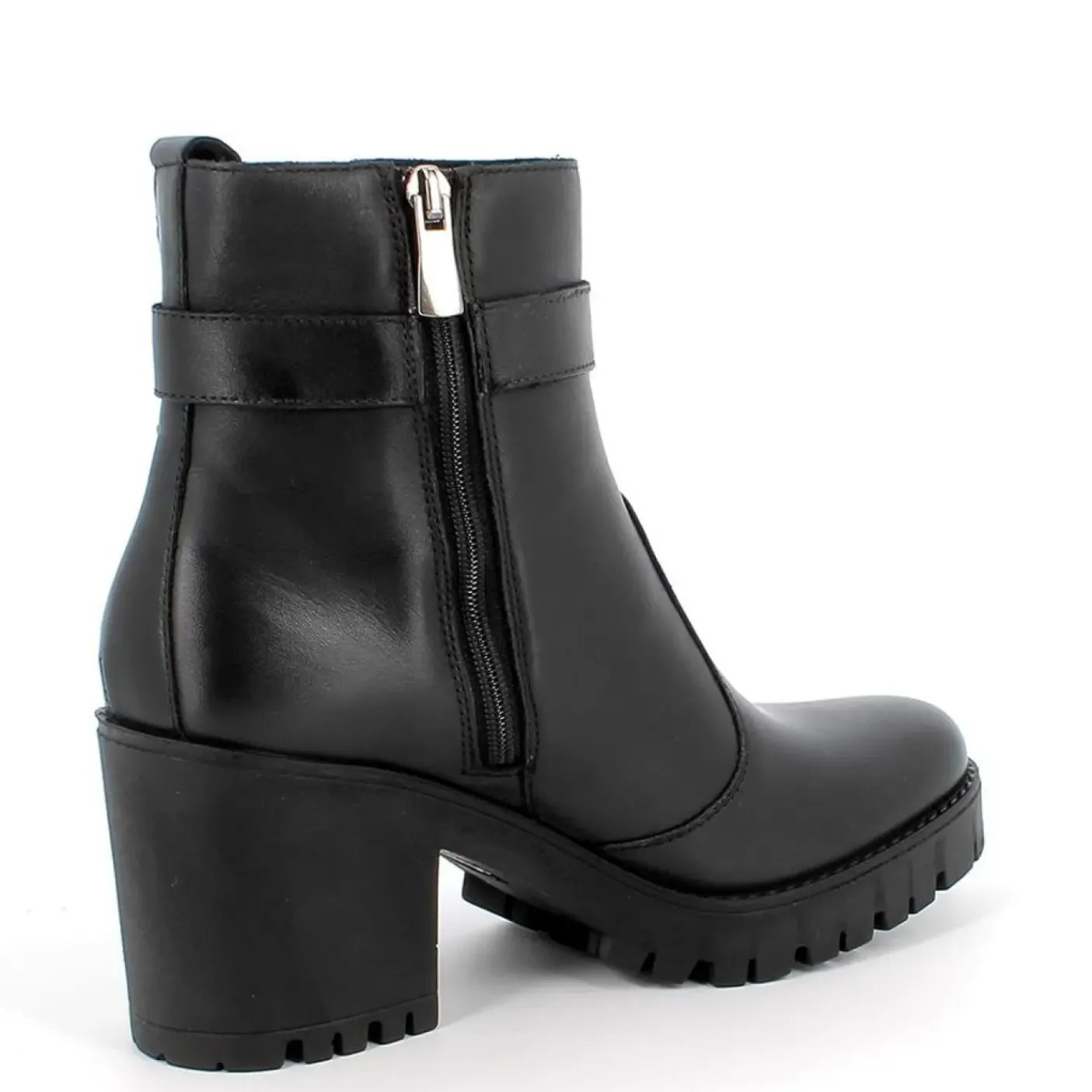 Tronchetti in pelle morbida, Rivestiti internamente in pelle. Fibbia decorativa sulla caviglia. Soletta estraibile. Chiusura con zip. Fondo in gomma tacco 8cm.
