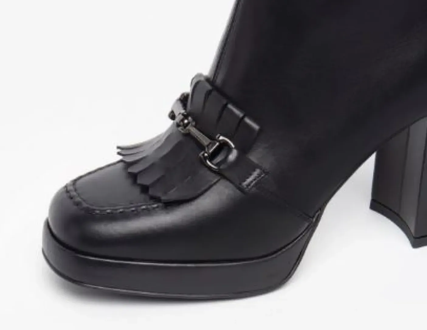 Tronchetti in vera pelle, rivestito internamente in pelle. Fibbia metallica decorativa e frange in pelle. Chiusura con zip. Fondo gomma tacco 9cm