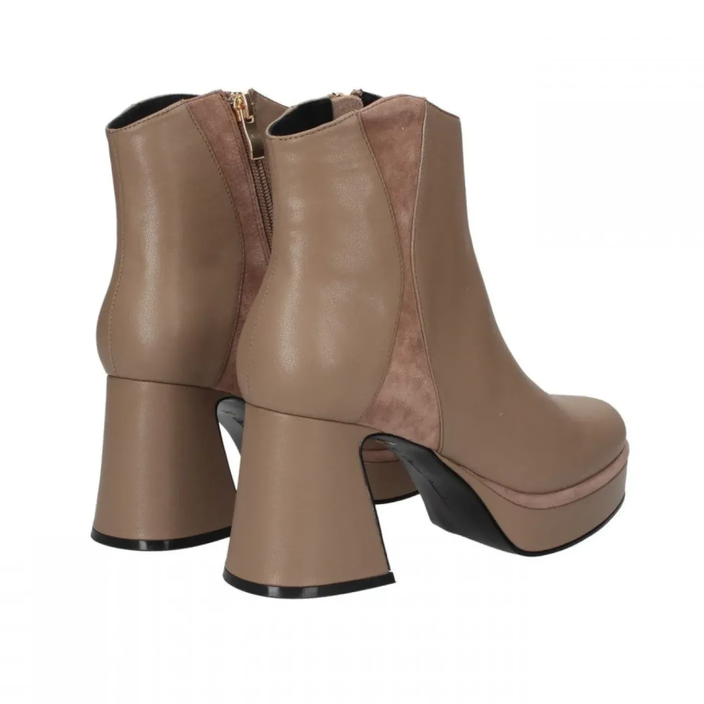 Tronchetti in vera pelle morbida con inserto camoscio. Rivestita internamente in pelle. Chiusura con zip laterale. Tacco 8cm plateau 3cm. Caviglia stretta.
