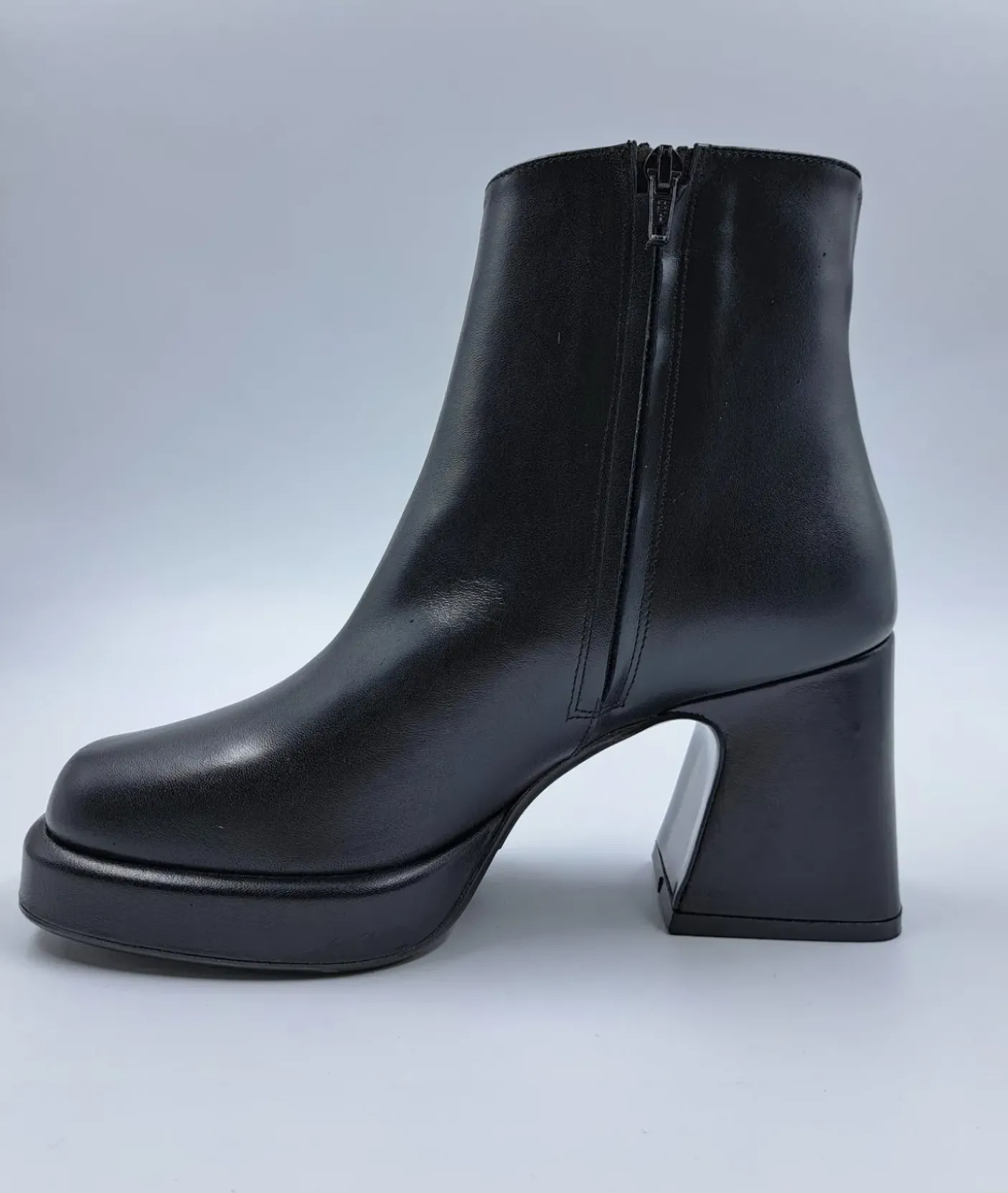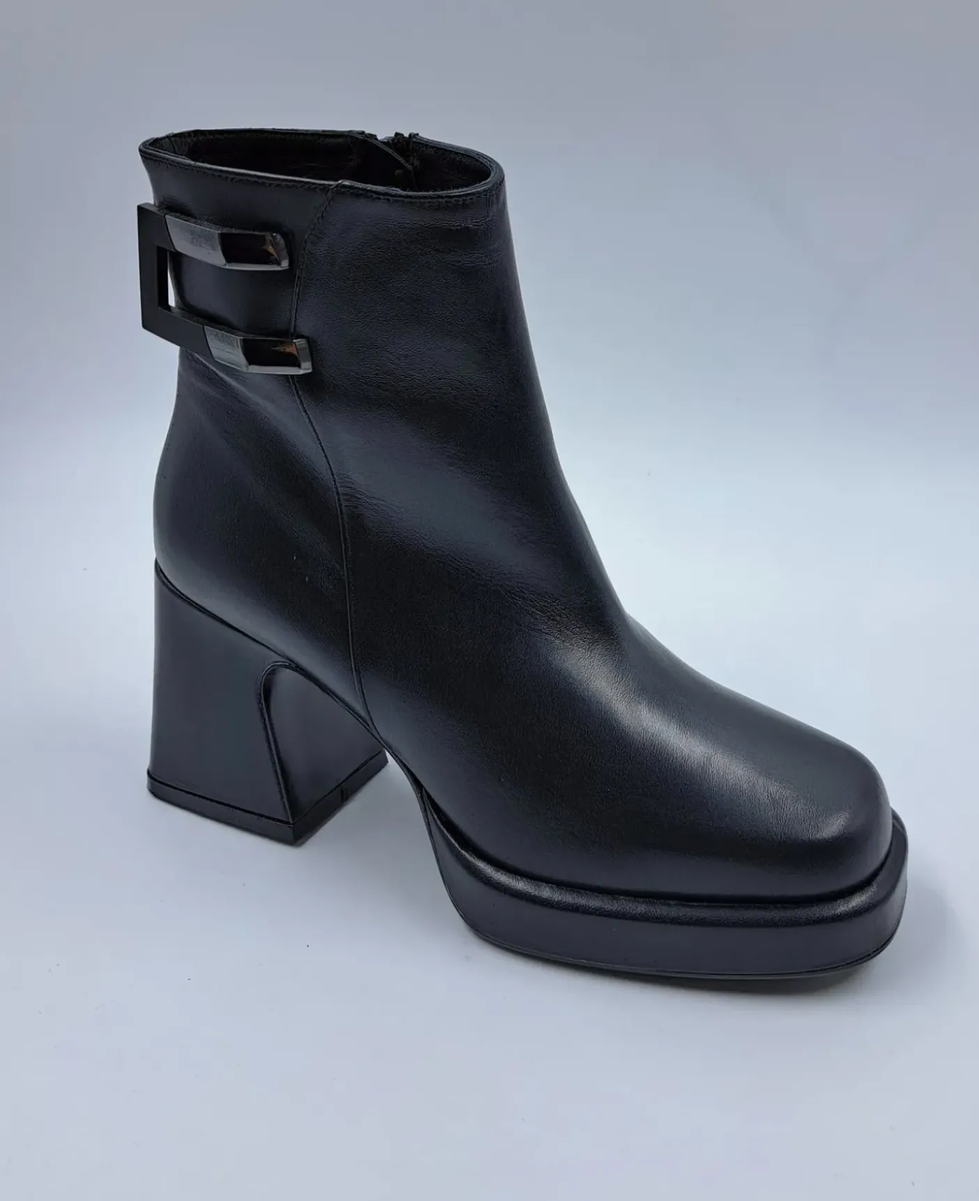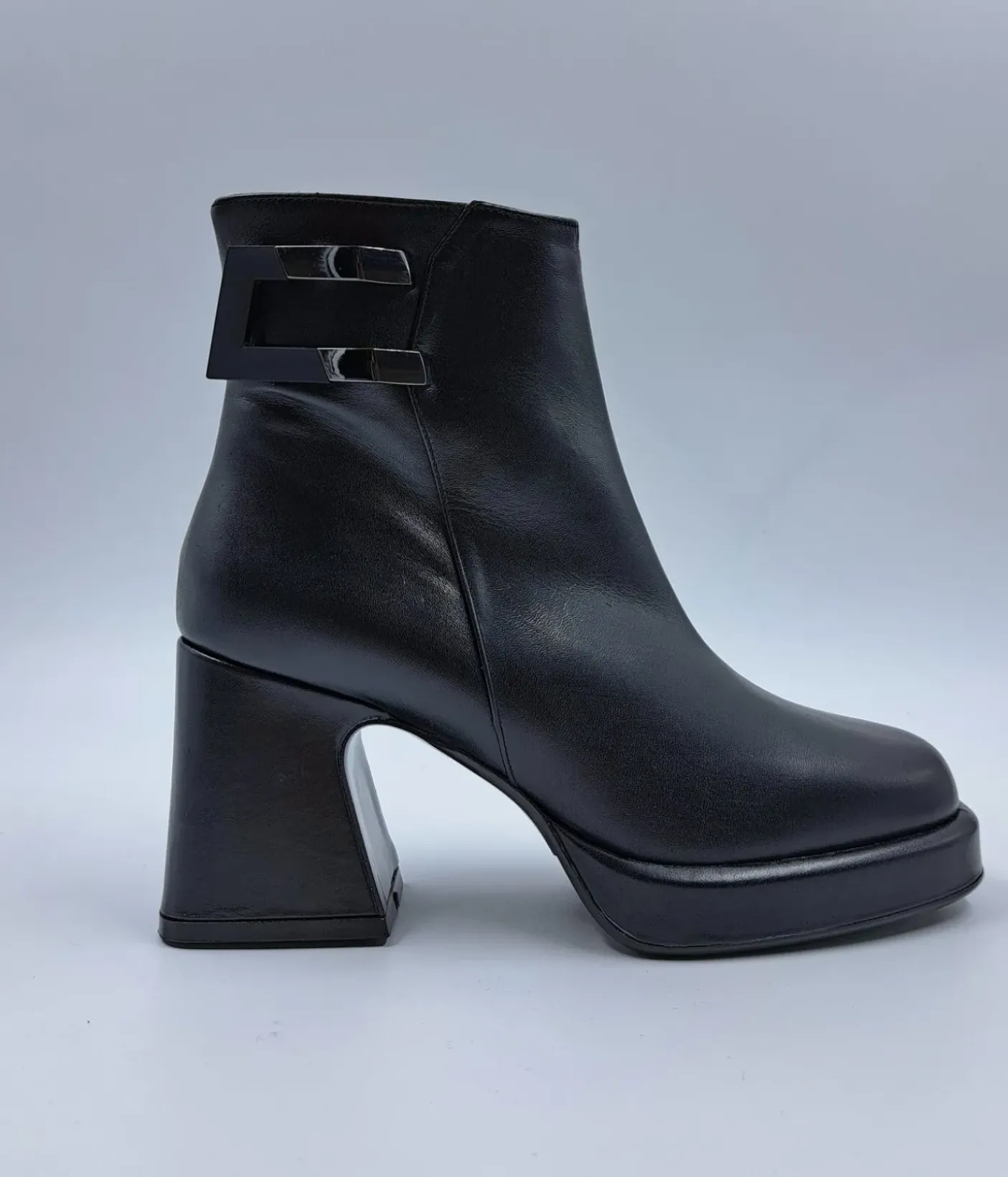 Tronchetto in vera pelle, rivestito internamente in pelle. Chiusura con zip. Applicazione metallica sul lato. Fondo gomma e tacco squadrato 8cm.