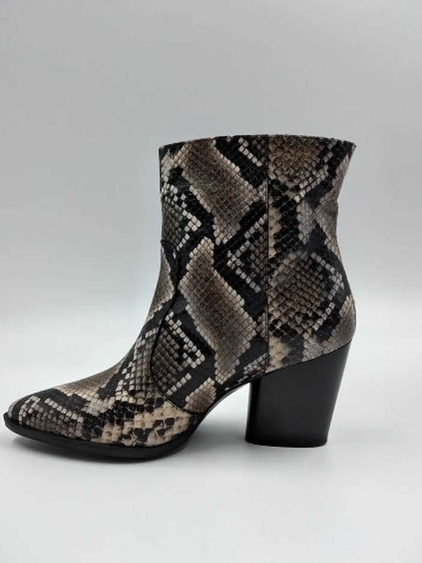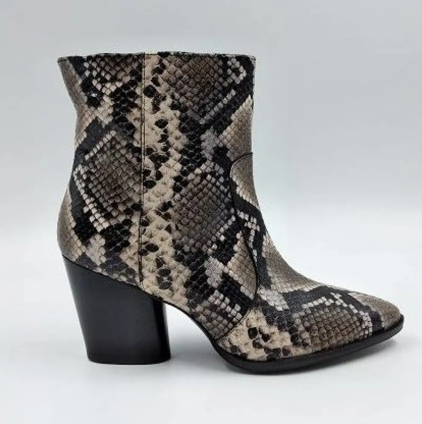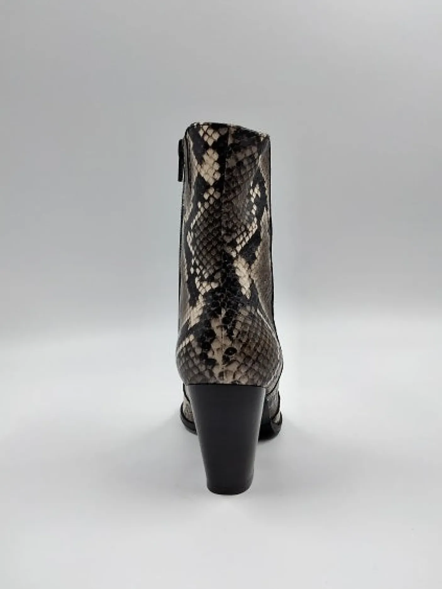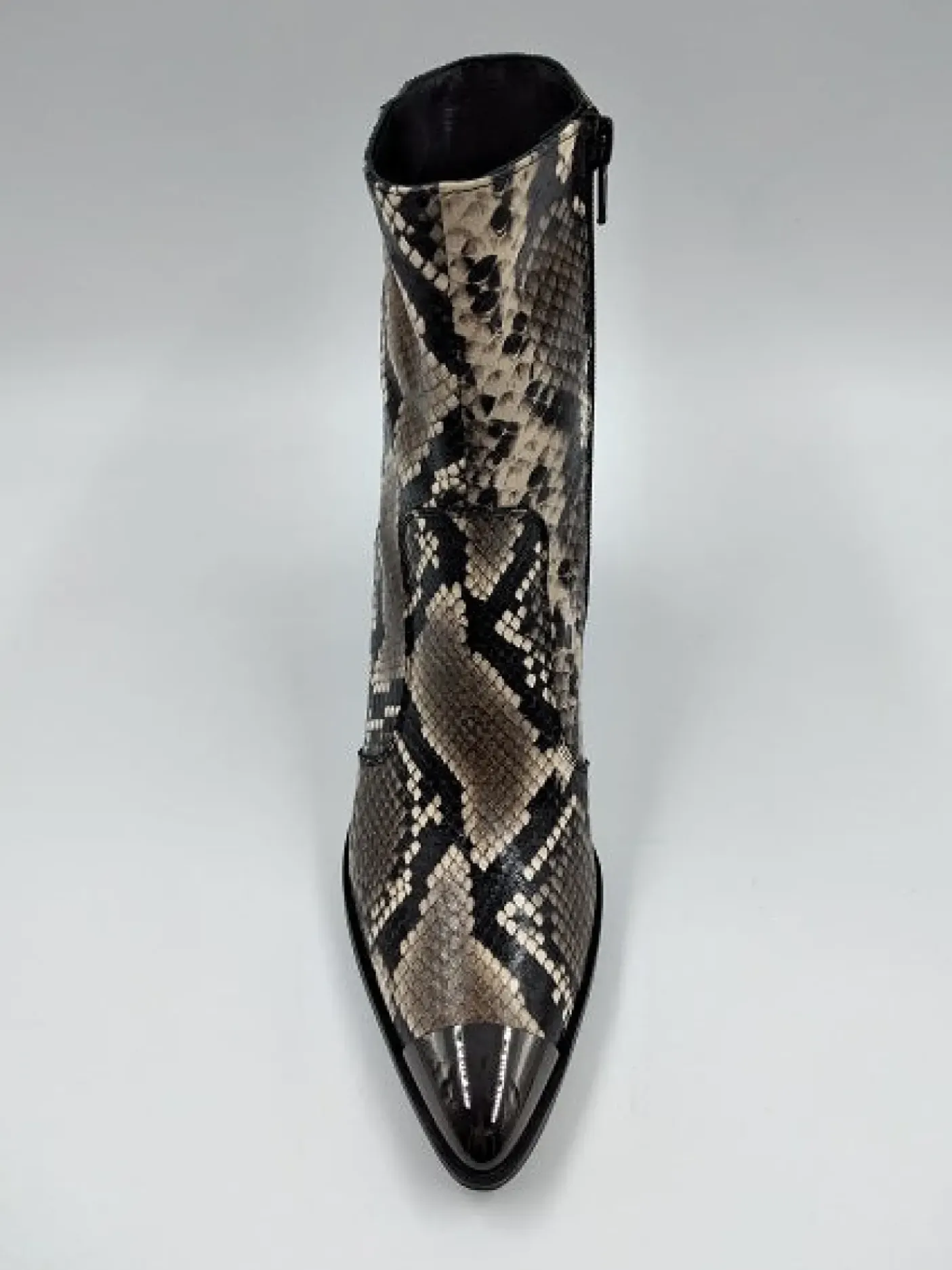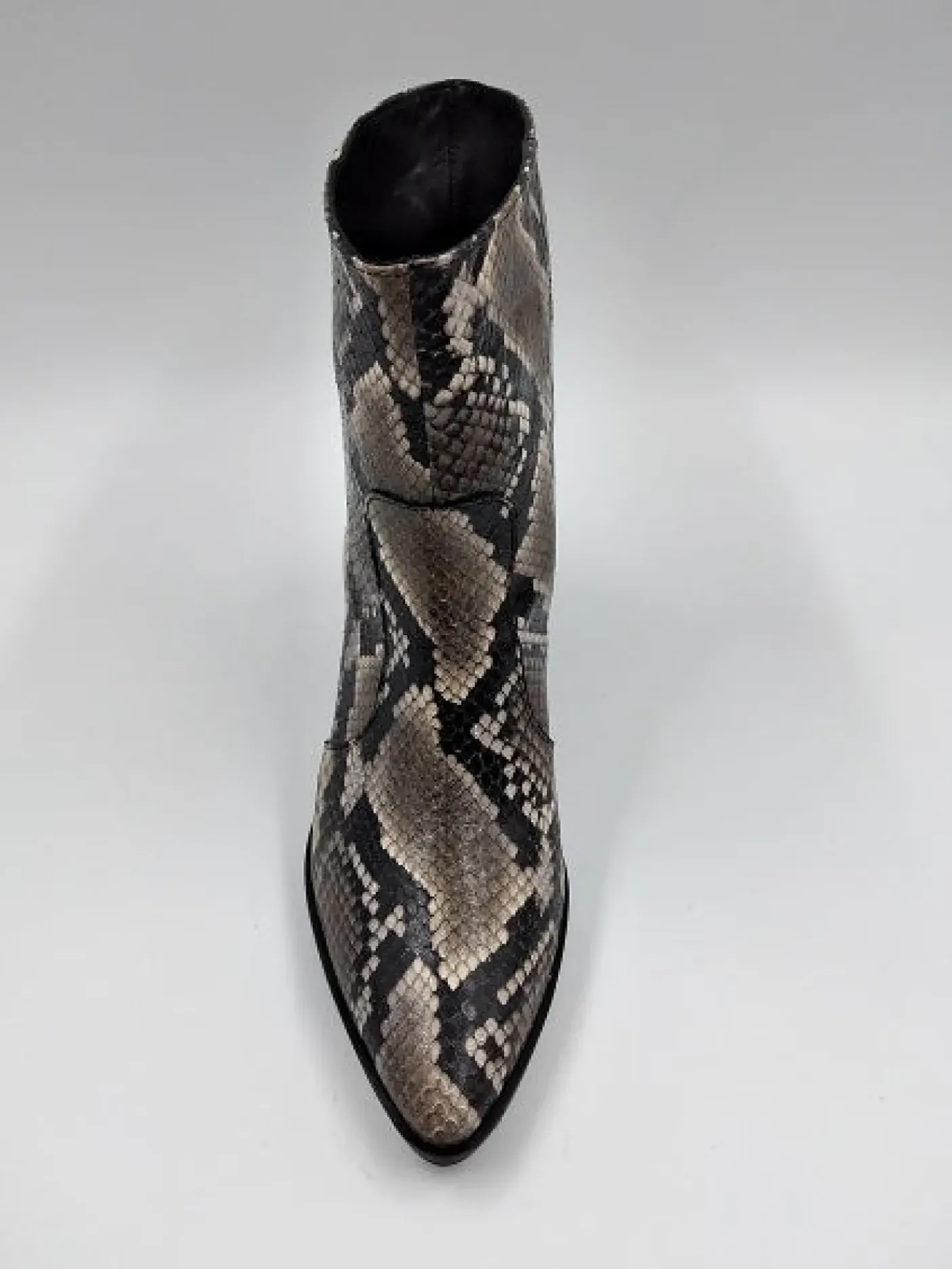 Tronchetto in pelle effetto pitonato con punta affusolata. Interno e sottopiede foderato in pelle. Suola in gomma. Tacco 8cm.