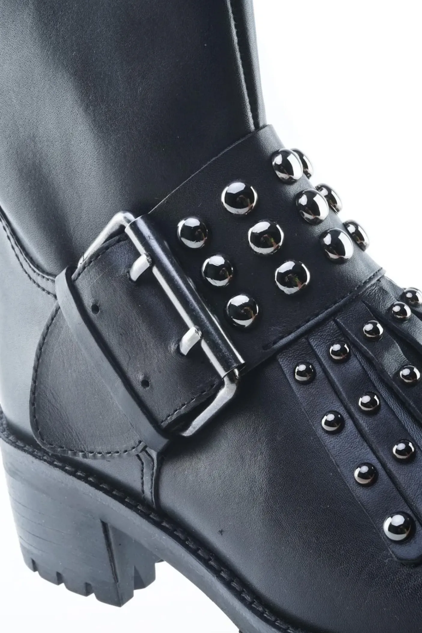 Anfibio in pelle con fibbia decorativa e frange con borchie color argento. Fondo in gomma. Chiusura con zip