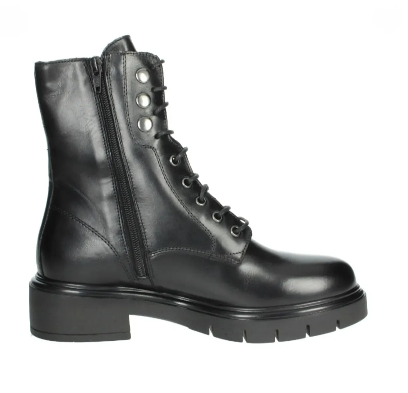 Anfibi in vera pelle morbida. Rivestito internamente in pelle e tessuto. Chiusura con lacci e zip laterale. Fondo gomma tacco 5cm