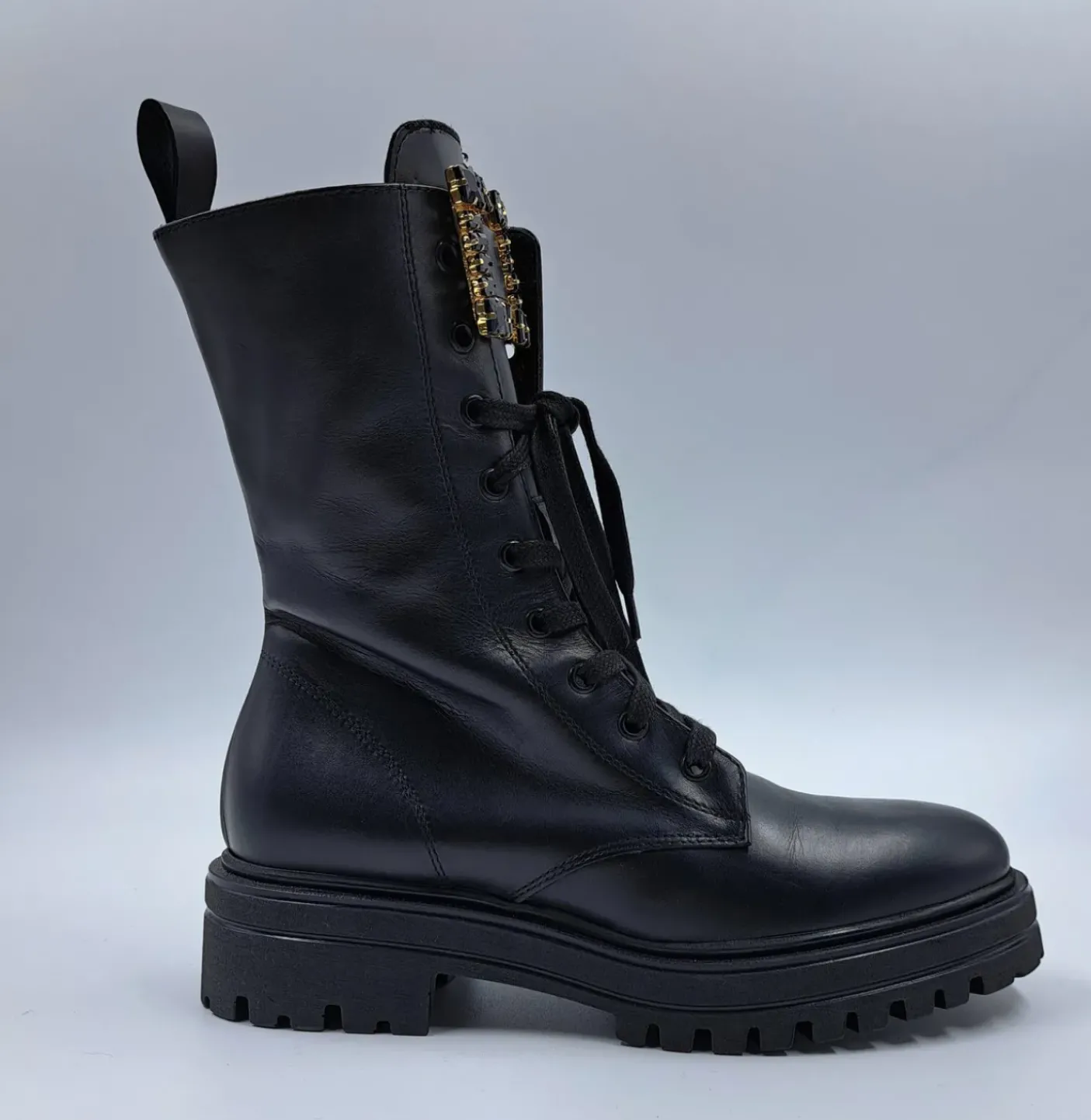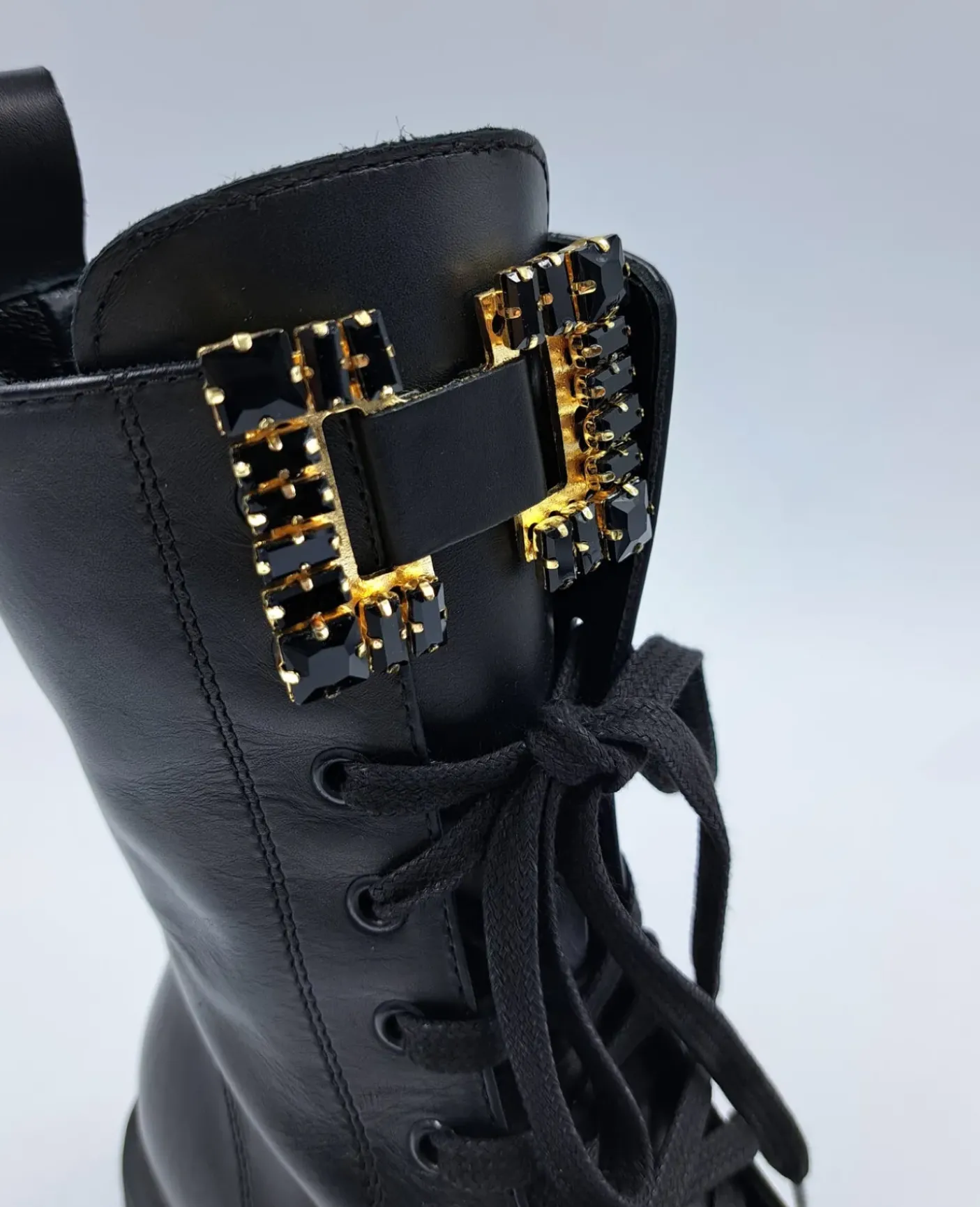 Anfibi in vera pelle, rivestito internamente in pelle. Applicazione strass neri metallo gold sulla linguetta. Chiusura con lacci. Fondo gomma.