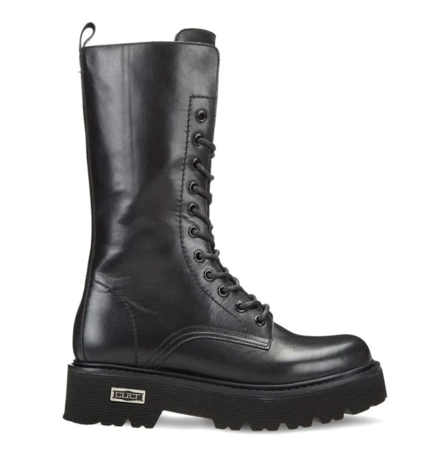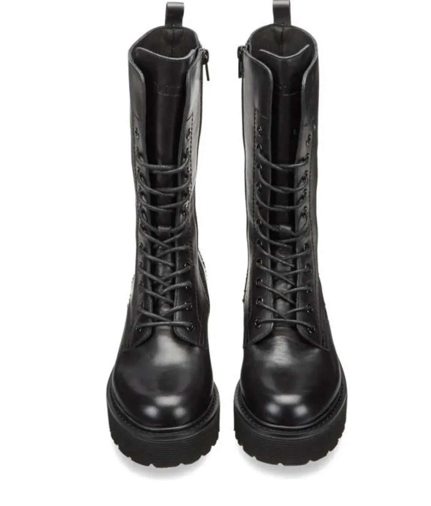 Anfibi In pelle nera, con chiusura tramite stringhe su occhielli tono su tono. Targhetta con logo sulla suola di gomma e tirante posteriore. Chiusura con zip e lacci. Fondo gomma 4cm.
