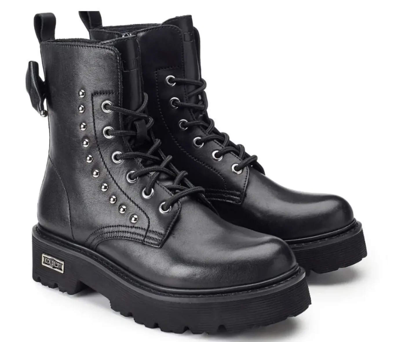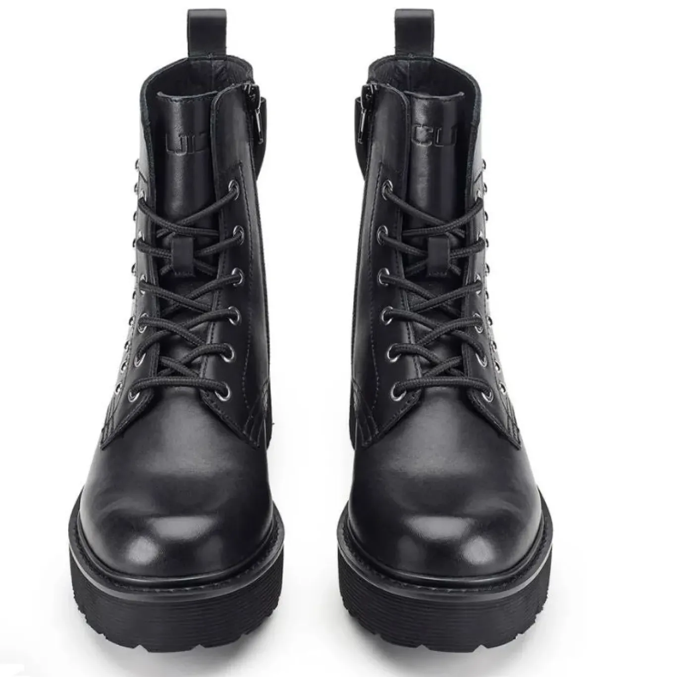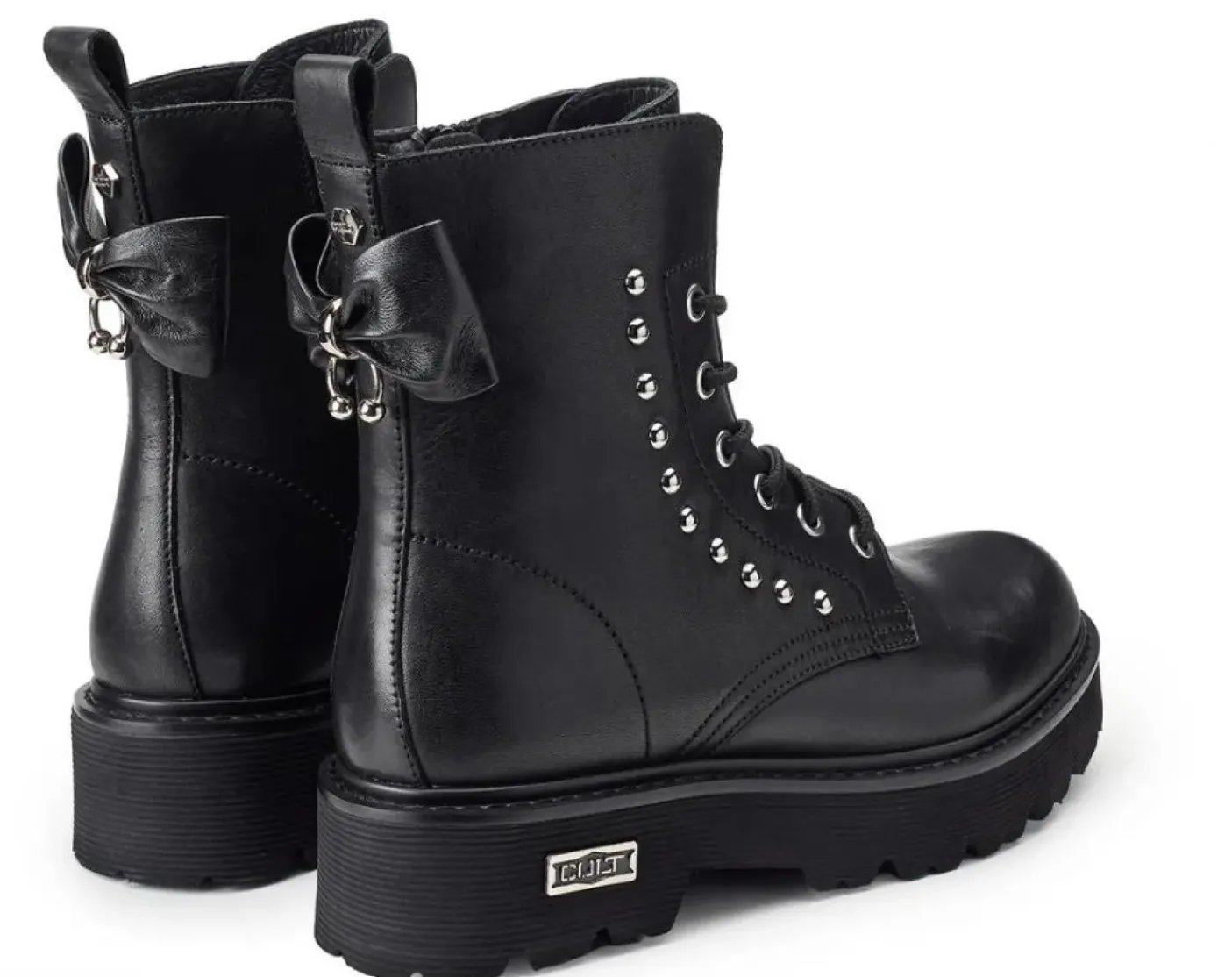 Anfibio in vera pelle con chiusura a stringhe e suola rinforzata. Decorato con applicazioni mini borchie, fiocco in pelle con piercing metallico posteriore. Chiusura con lacci e zip laterale. Linguetta posteriore. Altezza suola 5cm