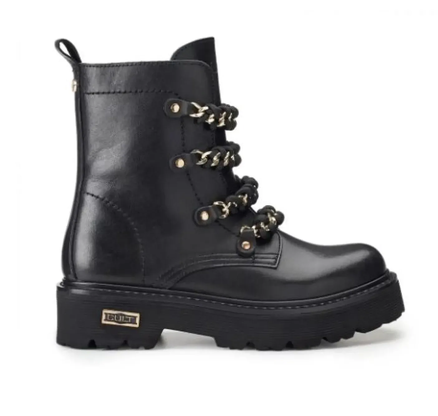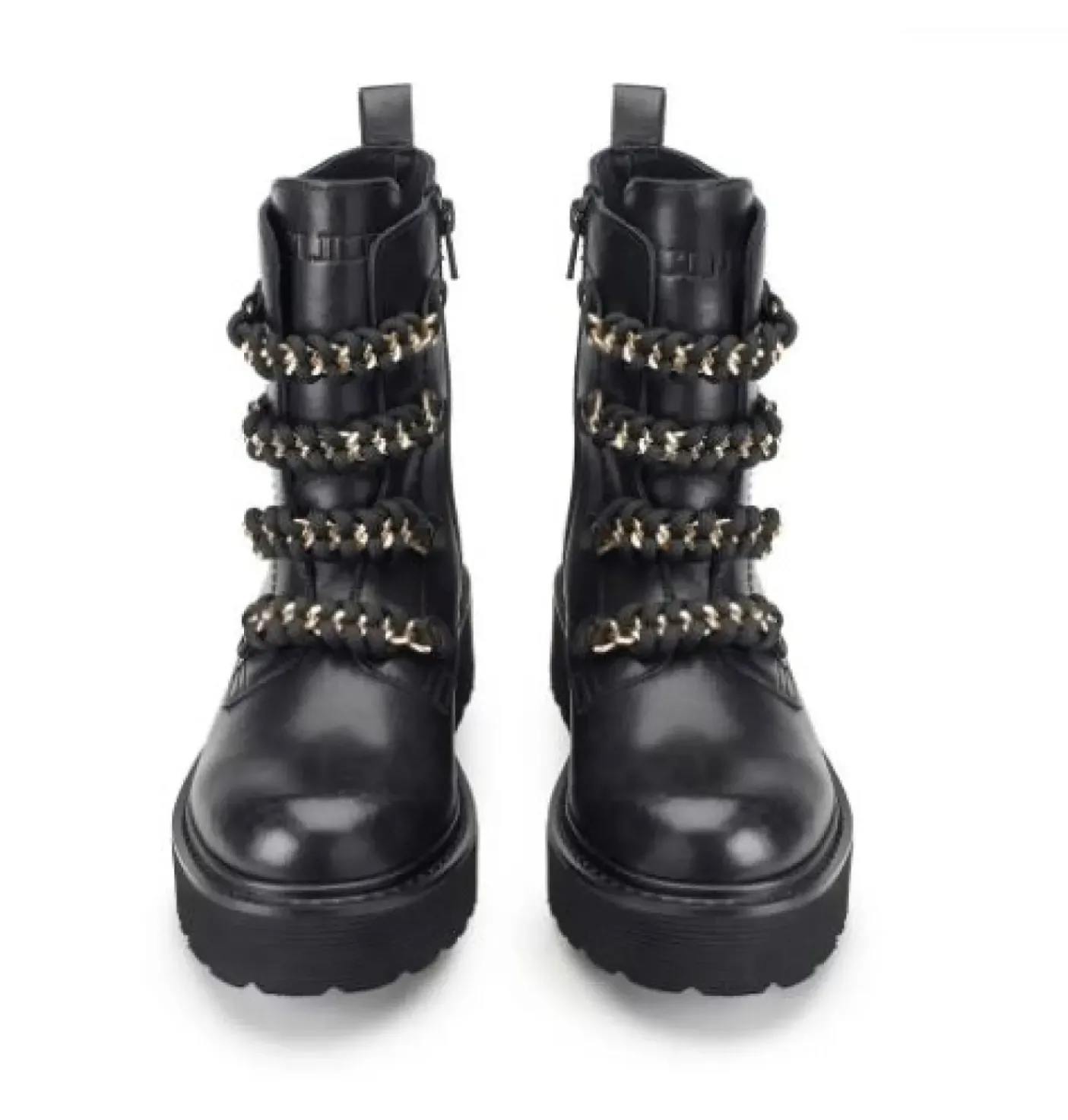 Anfibio in vera pelle con applicazioni catena gold e cotone nero. Chiusura con zip laterale. Suola in gomma 4cm, logo sul laterale gomma.
