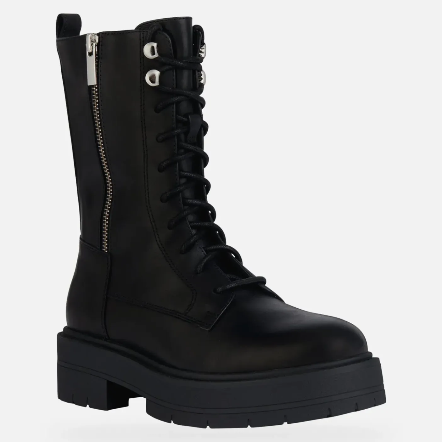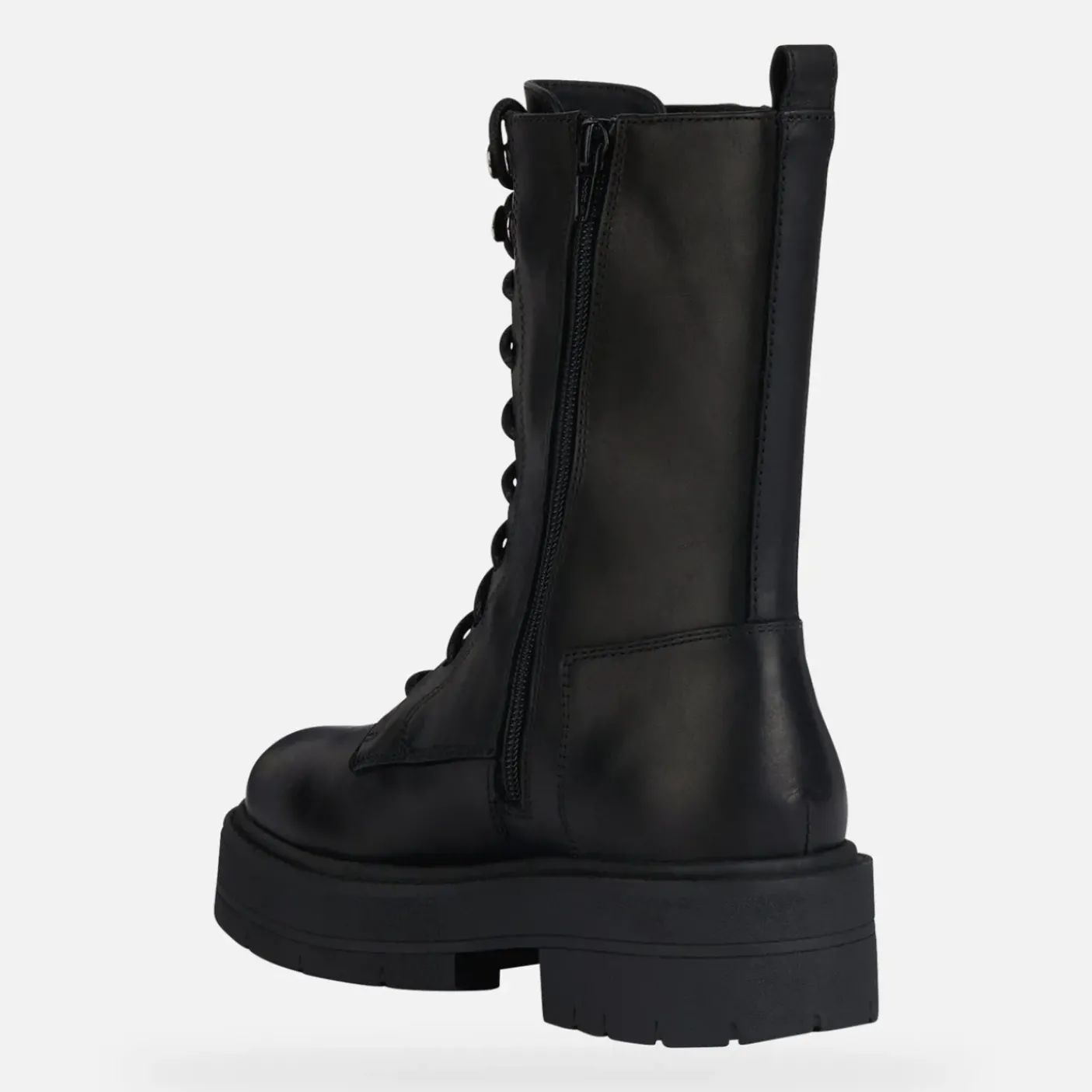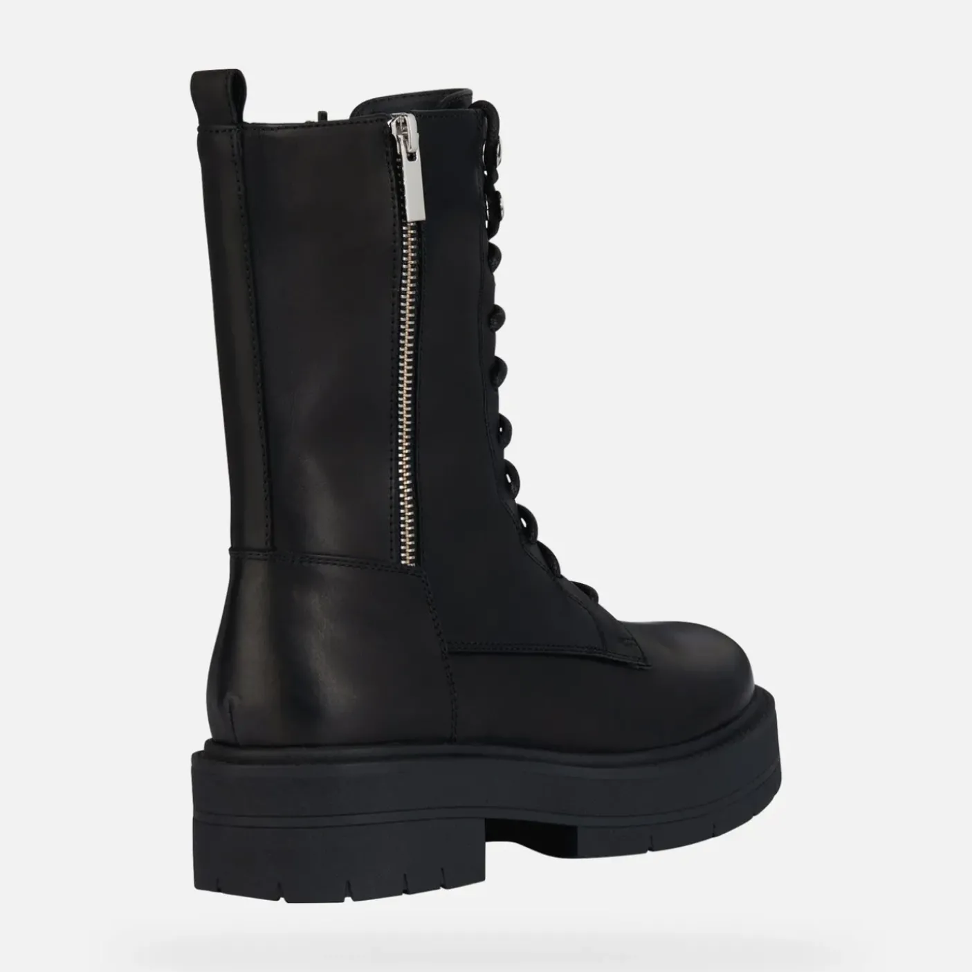 Anfibi in pelle morbida con interno in tessuto e pelle. Soletta in pelle estraibile. Zip esterna decorativa. Chiusura con lacci e zip laterale. Fondo gomma brevetto GeoxRespira 4,5cm