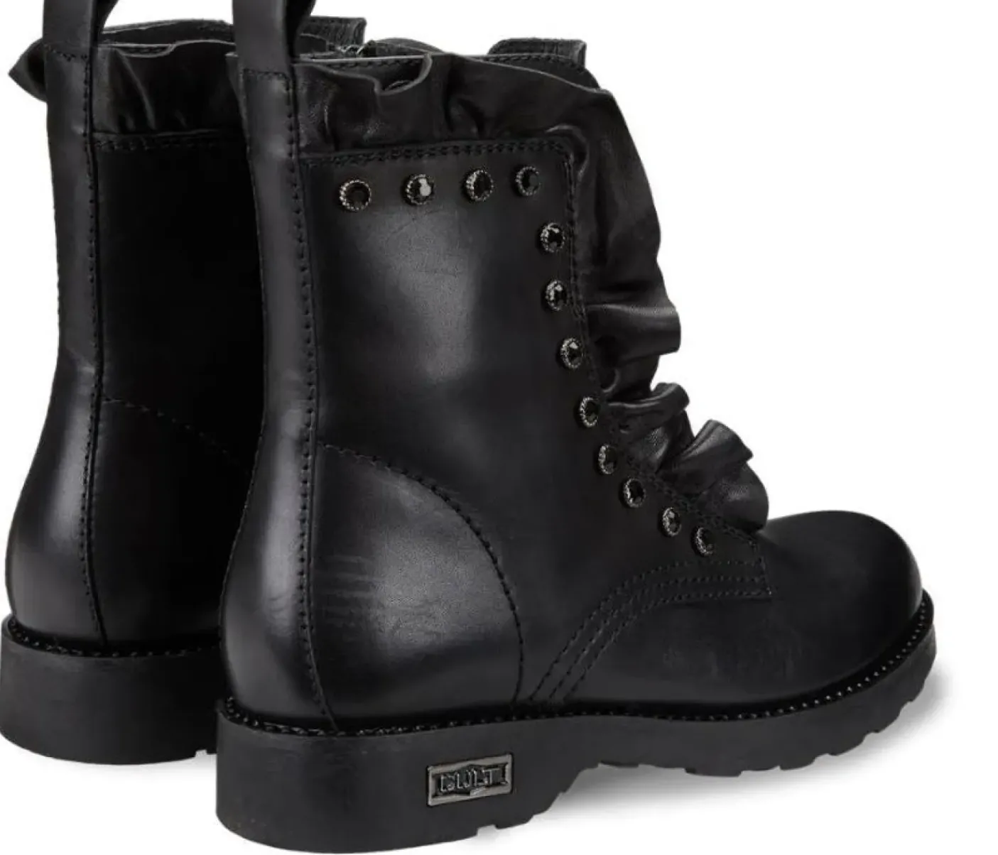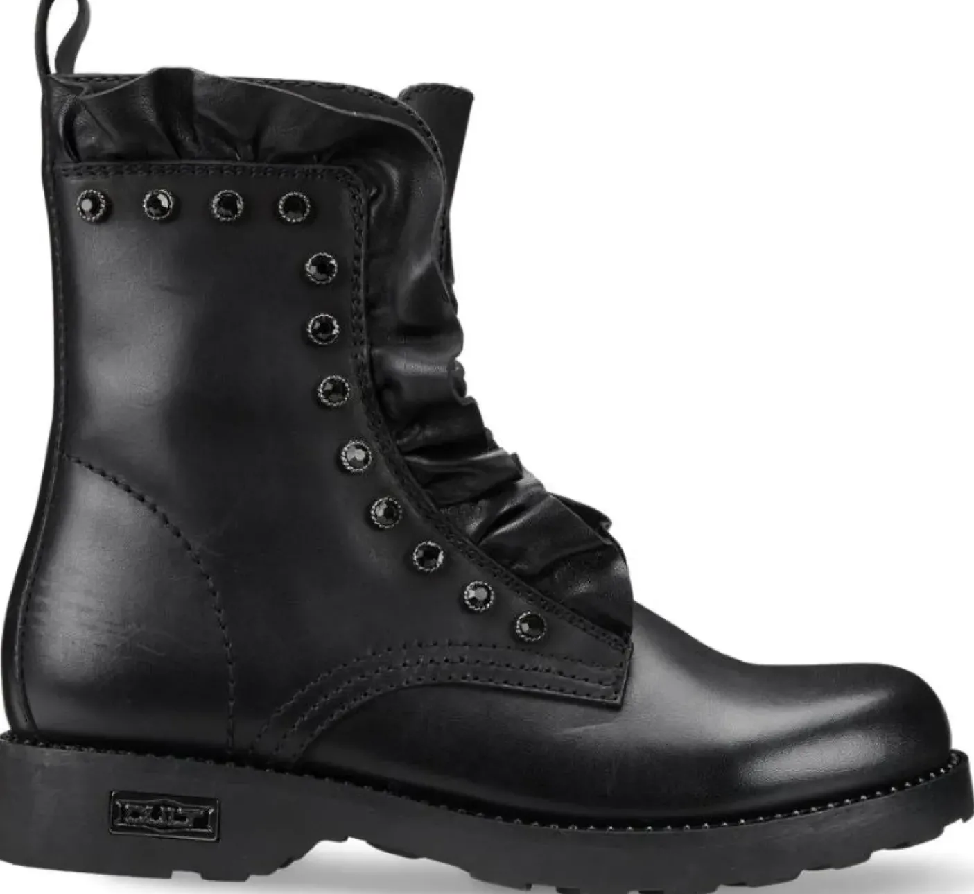 Anfibi in vera pelle con occhielli in metallo, impreziositi da ruches e mini borchie. linguetta posteriore. Fondo gomma.