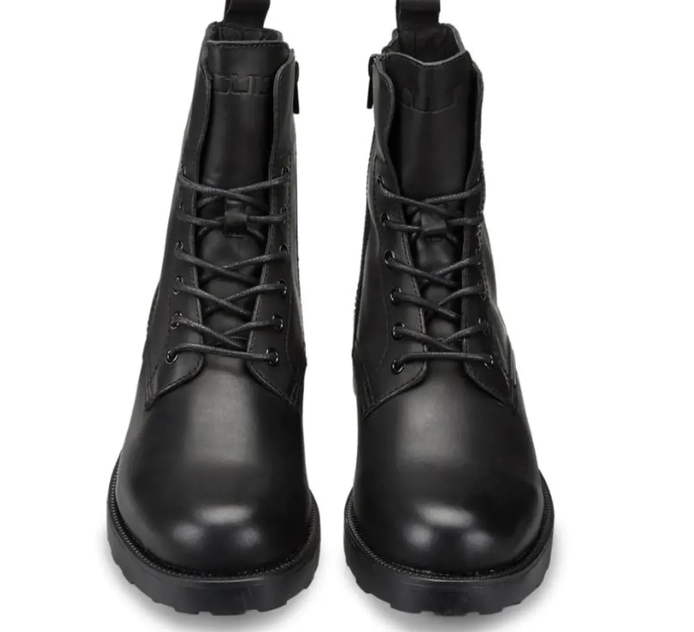 Anfibi in vera pelle, con occhielli tono su tono, targhetta con logo sulla suola di gomma e linguetta posteriore.