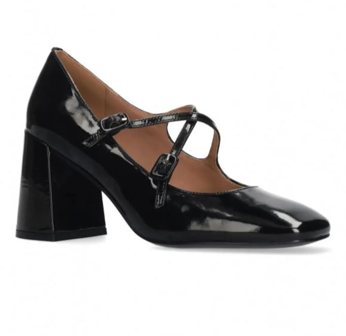 Ballerina in pelle lucida, rivestiti internamente in pelle. Chiusura con doppio cinturino incrociato regolabile. Tacco 8cm.